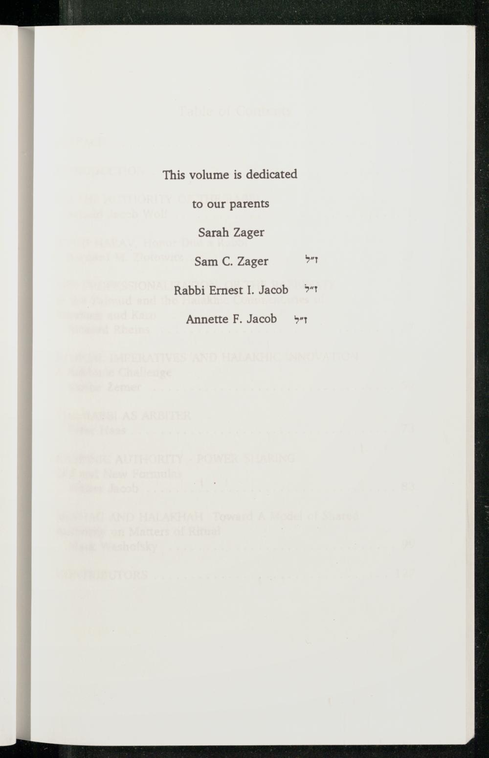 This volume is dedicated to our parents Sarah Zager Sam C. Zager ז"ל Rabbi Ernest I. Jacobז"ל Annette F. Jacob ז"ל