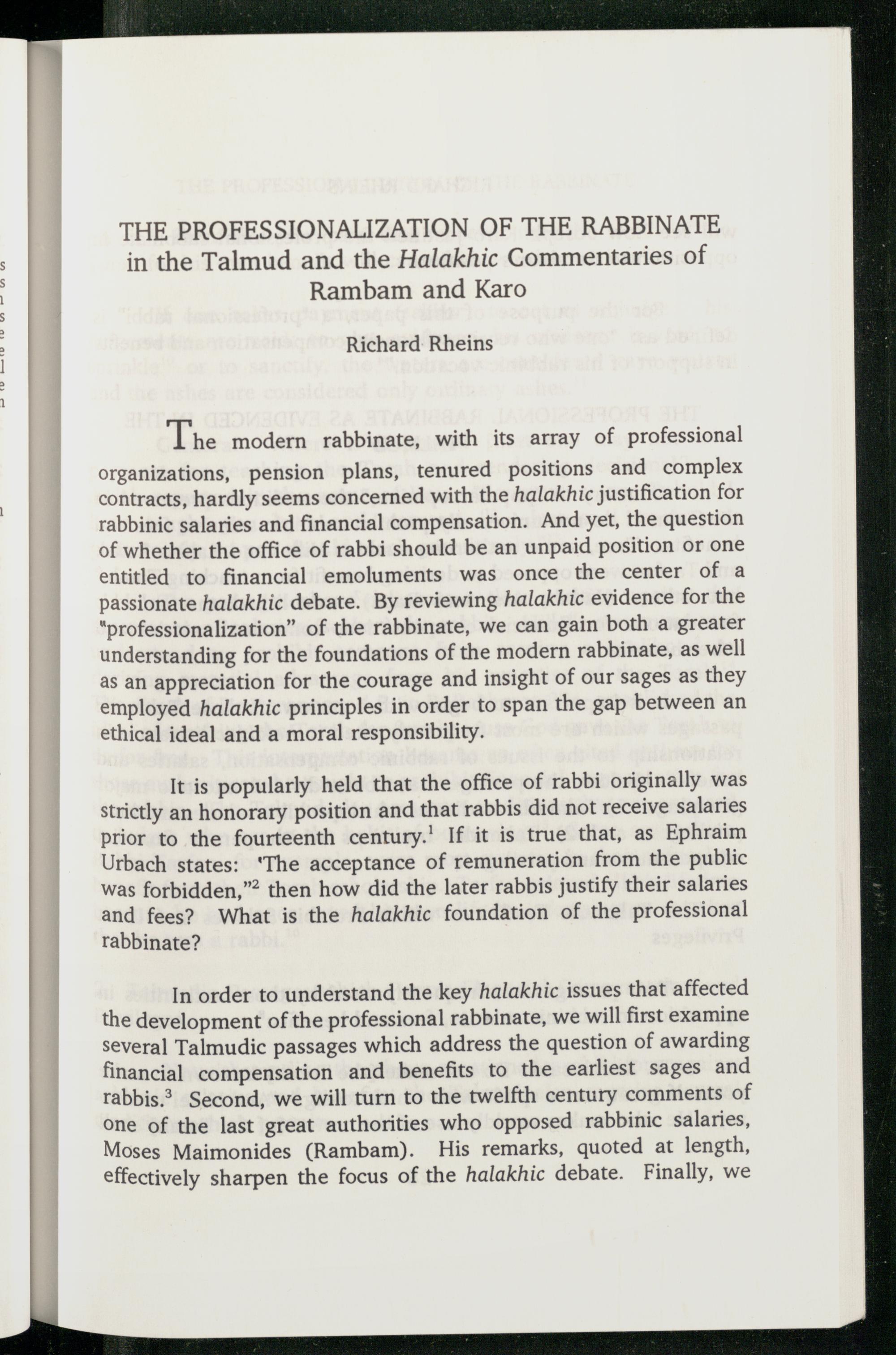 Te modern rabbinate, with its array of professional organizations, pension plans, tenured positions and complex contracts, hardly seems concerned with the halakhic justification for rabbinic salaries and financial compensation. And yet, the question of whether the office of rabbi should be an unpaid position or one entitled to financial emoluments was once the center of a passionate halakhic debate. By reviewing halakhic evidence for the “professionalization” of the rabbinate, we can gain both a greater understanding for the foundations of the modern rabbinate, as well as an appreciation for the courage and insight of our sages as they employed halakhic principles in order to span the gap between an ethical ideal and a moral responsibility.