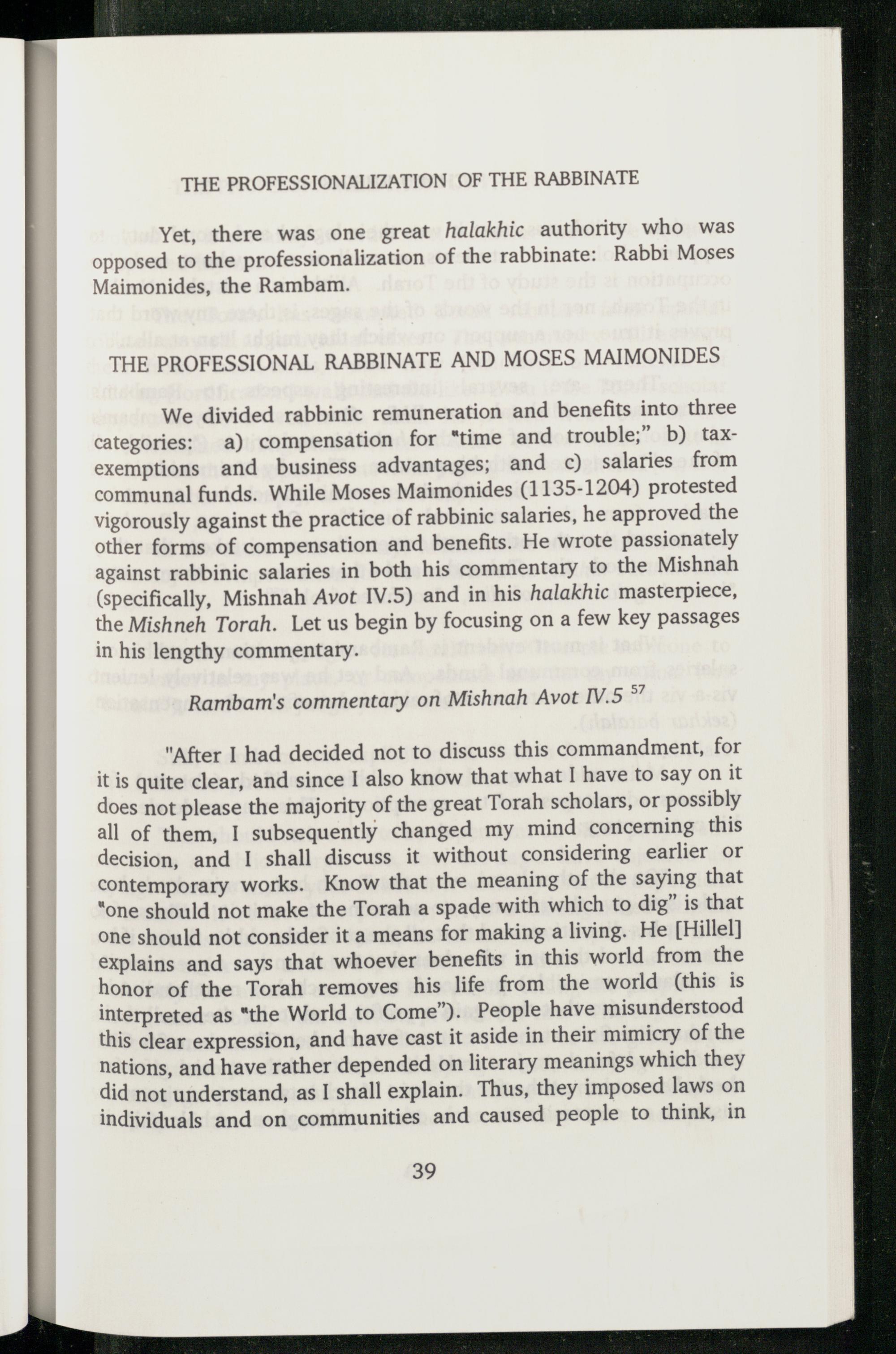 We divided rabbinic remuneration and benefits into three categories: a) compensation for“time and trouble;” b) taxexemptions and business advantages; and c) salaries from communal funds. While Moses Maimonides (1135-1204) protested vigorously against the practice of rabbinic salaries, he approved the other forms of compensation and benefits. He wrote passionately against rabbinic salaries in both his commentary to the Mishnah (specifically, Mishnah Avot IV.5) and in his halakhic masterpiece, the Mishneh Torah . Let us begin by focusing on a few key passages in his lengthy commentary.