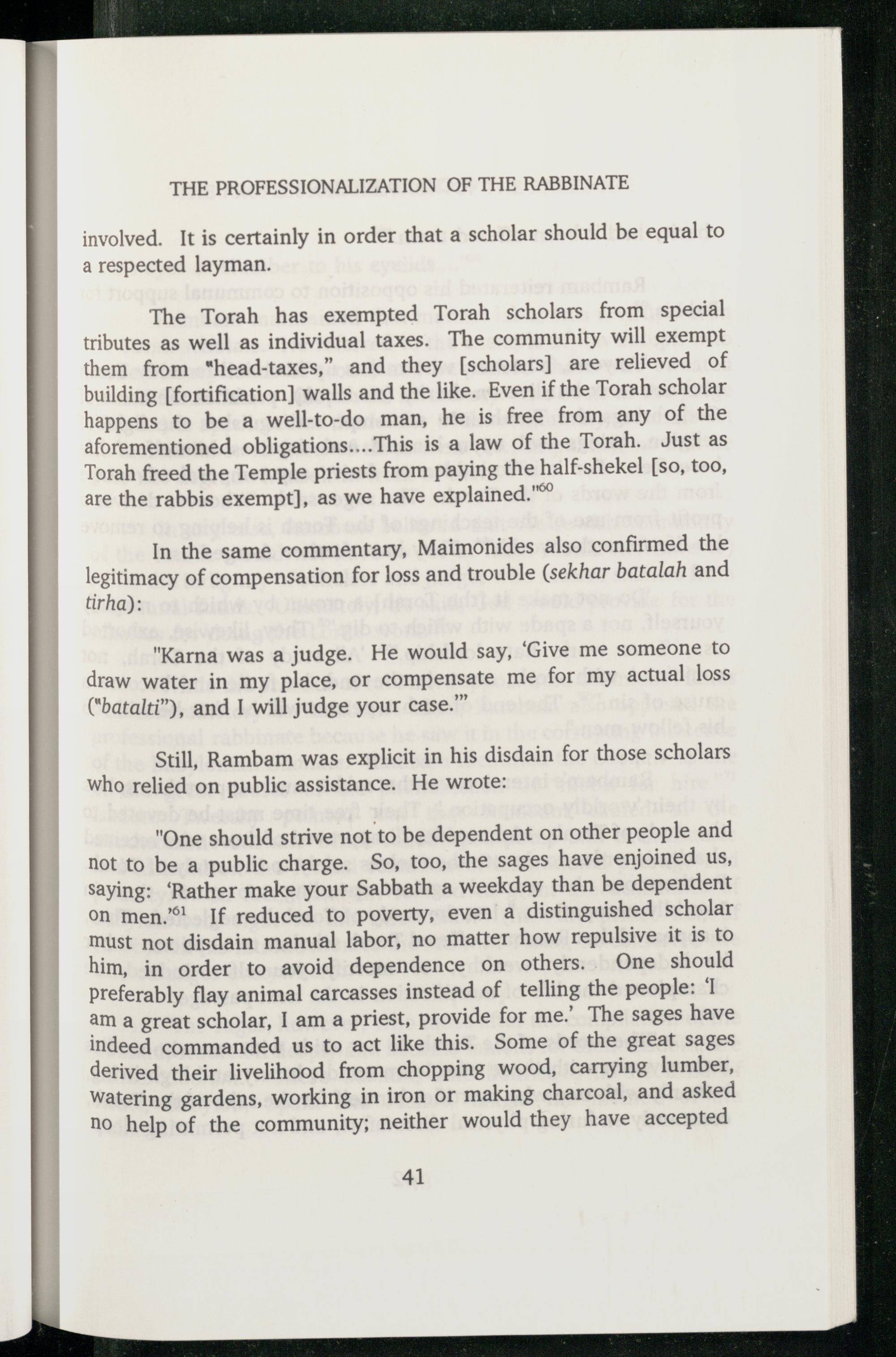 "One should strive not to be dependent on other people and not to be a public charge. So, too, the sages have enjoined us, saying:‘Rather make your Sabbath a weekday than be dependent on men’® If reduced to poverty, even a distinguished scholar must not disdain manual labor, no matter how repulsive it is to him, in order to avoid dependence on others. One should preferably flay animal carcasses instead of telling the people:‘I am a great scholar, 1 am a priest, provide for me.” The sages have indeed commanded us to act like this. Some of the great sages derived their livelihood from chopping wood, carrying lumber, watering gardens, working in iron or making charcoal, and asked no help of the community; neither would they have accepted