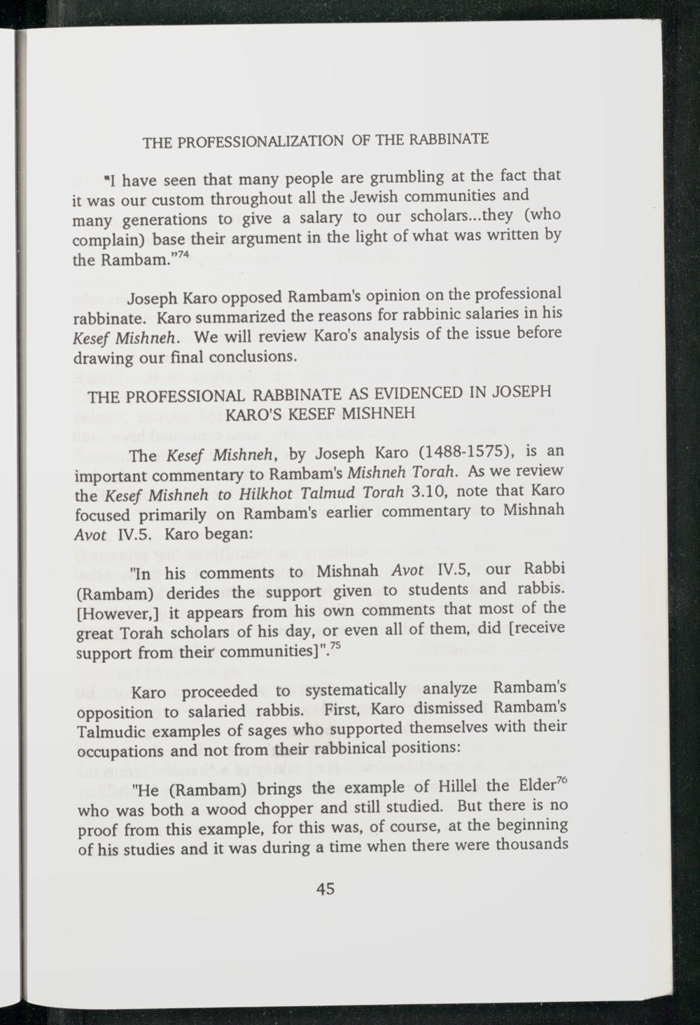 Joseph Karo opposed Rambam 's opinion on the professional rabbinate. Karo summarized the reasons for rabbinic salaries in his Kesef Mishneh. We will review Karo 's analysis of the issue before drawing our final conclusions.