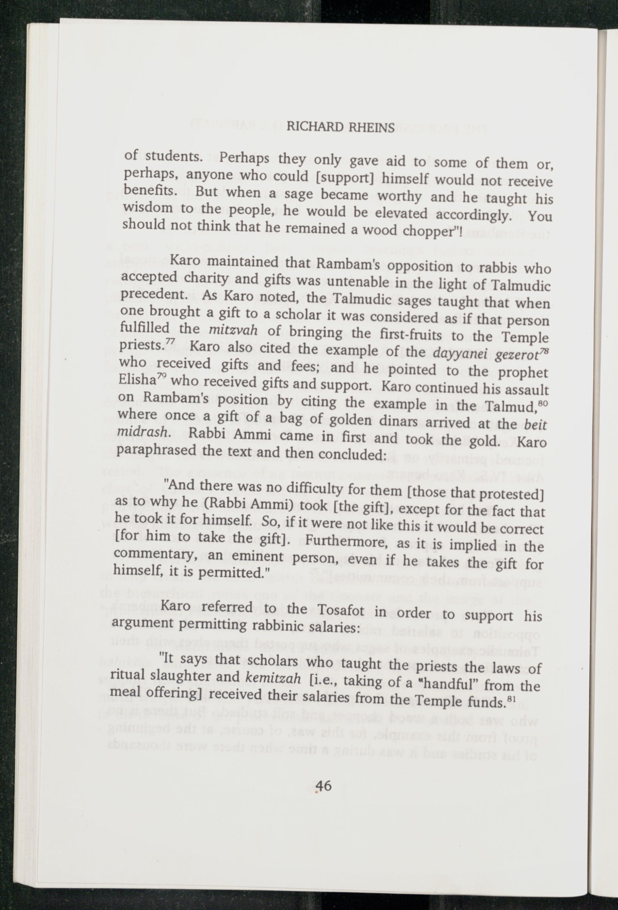 Karo maintained that Rambam 's opposition to rabbis who accepted charity and gifts was untenable in the light of Talmudic precedent. As Karo noted, the Talmudic sages taught that when one brought a gift to a scholar it was considered as if that person fulfilled the mitzvah of bringing the first-fruits to the Temple priests.” Karo also cited the example of the dayyanei gezerot™ who received gifts and fees; and he pointed to the prophet Elisha ” who received gifts and support. Karo continued his assault on Rambam 's position by citing the example in the Talmud, ® where once a gift of a bag of golden dinars arrived at the beit midrash. Rabbi Ammi came in first and took the gold. Karo paraphrased the text and then concluded: