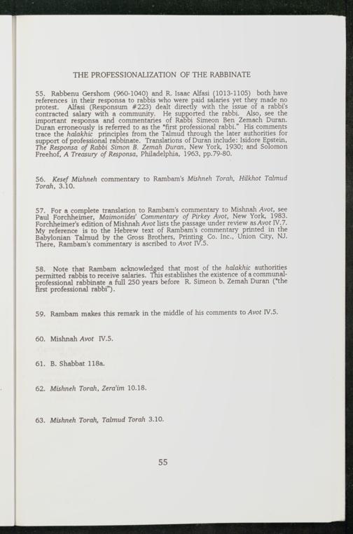 55. Rabbenu Gershom (960-1040) and R. Isaac Alfasi {ia510%) both have references in their responsa to rabbis who were paid salaries yet they made no protest. Alfasi (Responsum#223) dealt directly with the issue of a rabbi's contracted salary with a community. He supported the rabbi. Also, see the important responsa and commentaries of Rabbi Simeon Ben Zemach Duran. Duran erroneously is referred to as the“first professional rabbi.” His comments trace the halakhic principles from the Talmud through the later authorities for support of professional rabbinate. Translations of Duran include: Isidore Epstein , The Responsa of Rabbi Simon B. Zemah Duran, New York , 1930; and Solomon Freehof , A Treasury of Responsa, Philadelphia , 1963, pp.79-80.