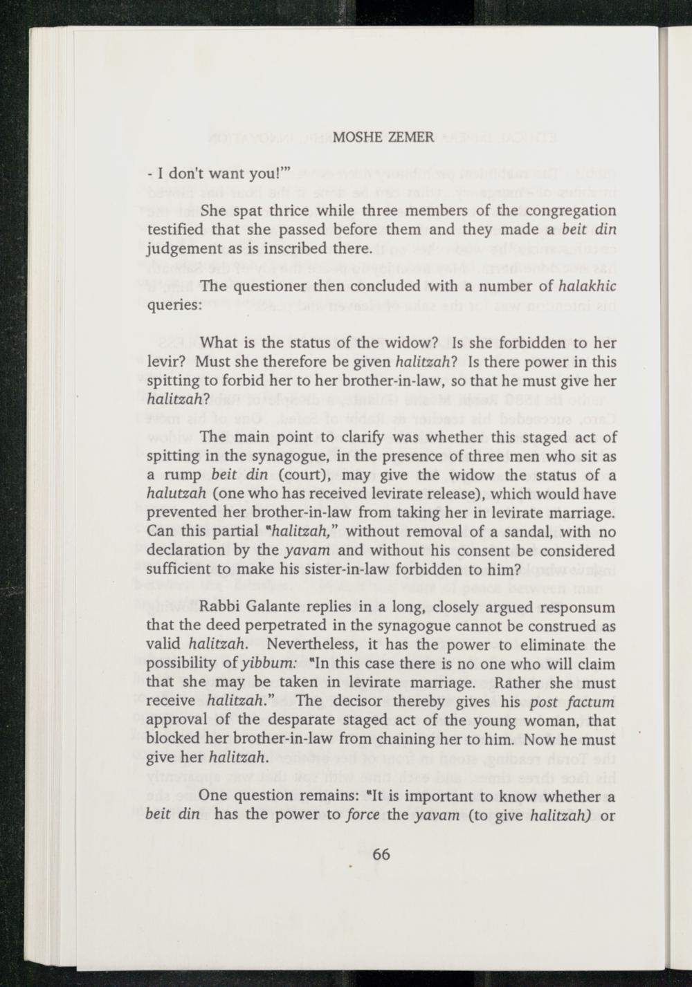 Rabbi Galante replies in a long, closely argued responsum that the deed perpetrated in the synagogue cannot be construed as valid halitzah. Nevertheless, it has the power to eliminate the possibility of yibbum:“In this case there is no one who will claim that she may be taken in levirate marriage. Rather she must receive halitzah.” The decisor thereby gives his post factum approval of the desparate staged act of the young woman, that blocked her brother-in-law from chaining her to him. Now he must give her halitzah.