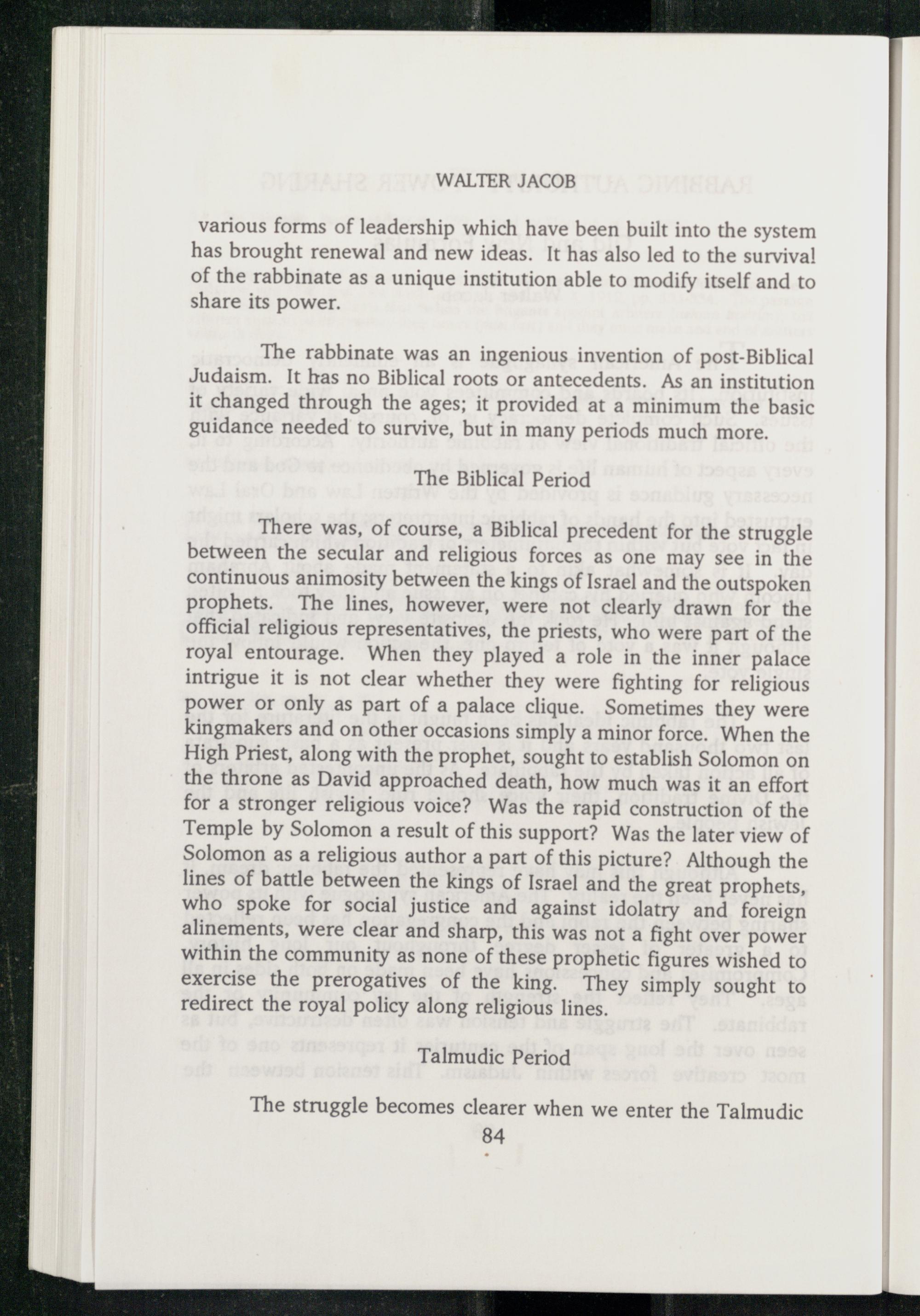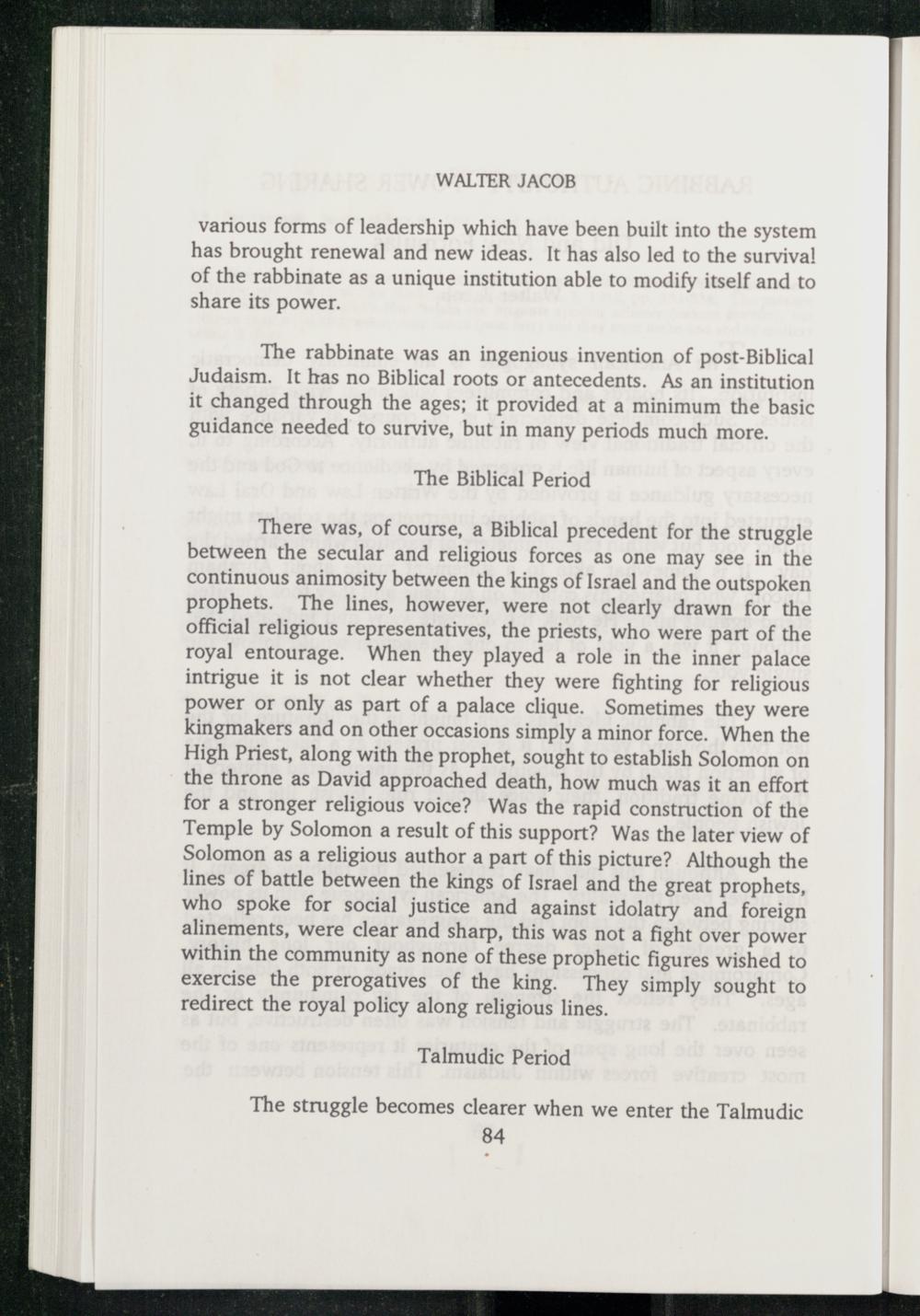 various forms of leadership which have been built into the system has brought renewal and new ideas. It has also led to the survival of the rabbinate as a unique institution able to modify itself and to share its power.
