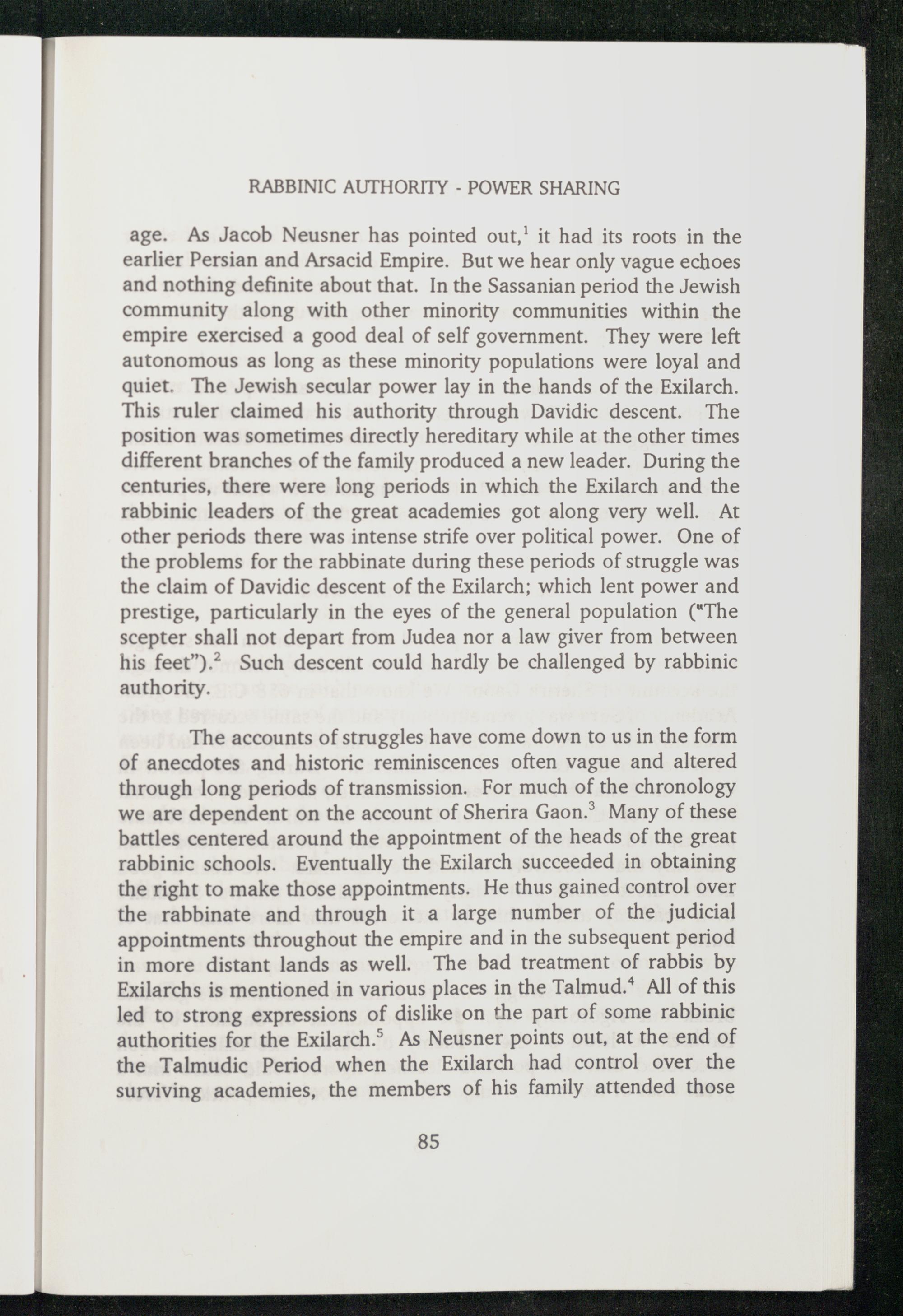 age. As Jacob Neusner has pointed out,’ it had its roots in the earlier Persian and Arsacid Empire . But we hear only vague echoes and nothing definite about that. In the Sassanian period the Jewish community along with other minority communities within the empire exercised a good deal of self government. They were left autonomous as long as these minority populations were loyal and quiet. The Jewish secular power lay in the hands of the Exilarch. This ruler claimed his authority through Davidic descent. The position was sometimes directly hereditary while at the other times different branches of the family produced a new leader. During the centuries, there were long periods in which the Exilarch and the rabbinic leaders of the great academies got along very well. At other periods there was intense strife over political power. One of the problems for the rabbinate during these periods of struggle was the claim of Davidic descent of the Exilarch; which lent power and prestige, particularly in the eyes of the general population(*The scepter shall not depart from Judea nor a law giver from between his feet”).> Such descent could hardly be challenged by rabbinic authority.