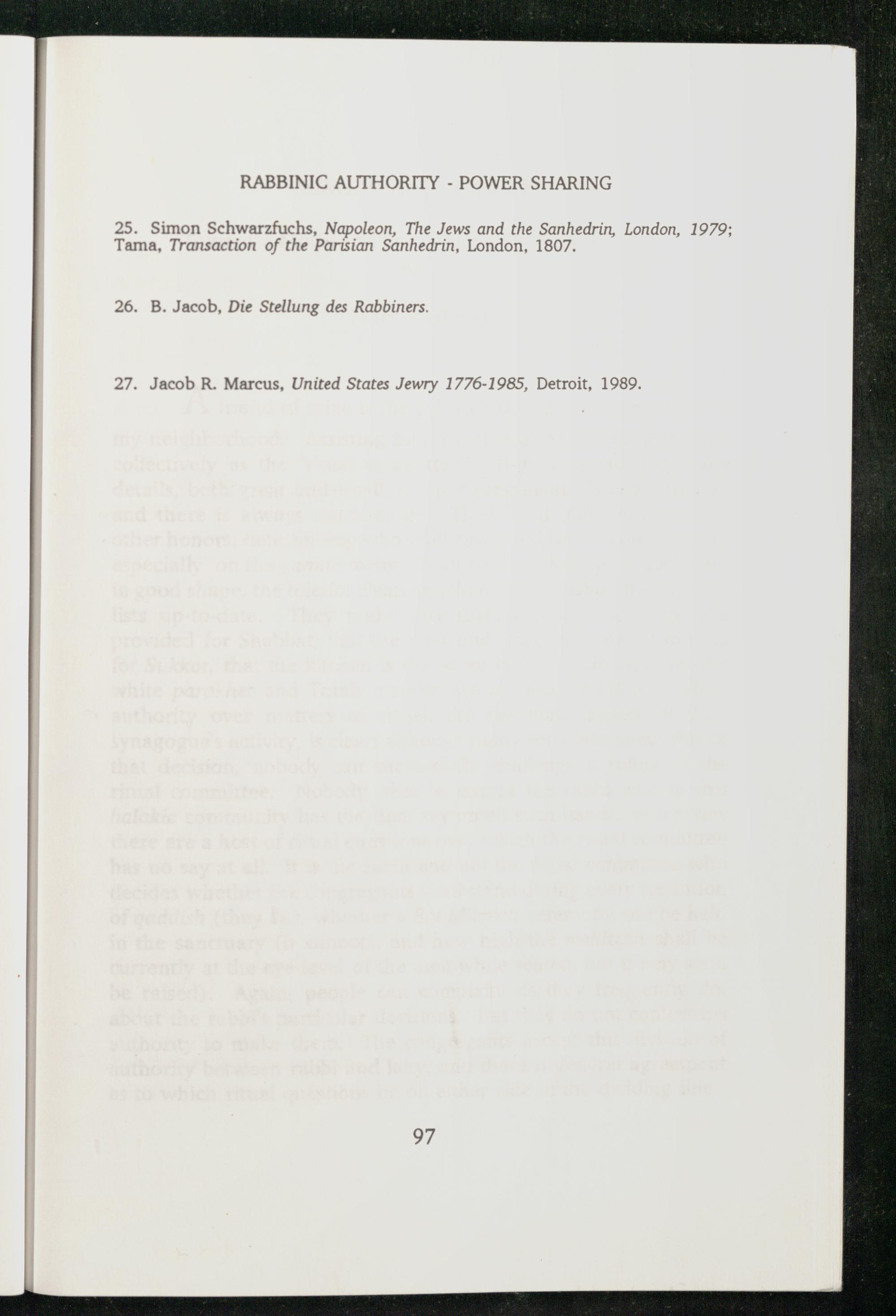 RABBINIC AUTHORITY- POWER SHARING 25. Simon Schwarzfuchs , Napoleon , The Jews and the Sanhedrin, London , 1979; Tama, Transaction of the Parisian Sanhedrin, London , 1807. 26. B. Jacob, Die Stellung des Rabbiners 27. Jacob R. Marcus , United States Jewry 1776-1985, Detroit , 1989. 97