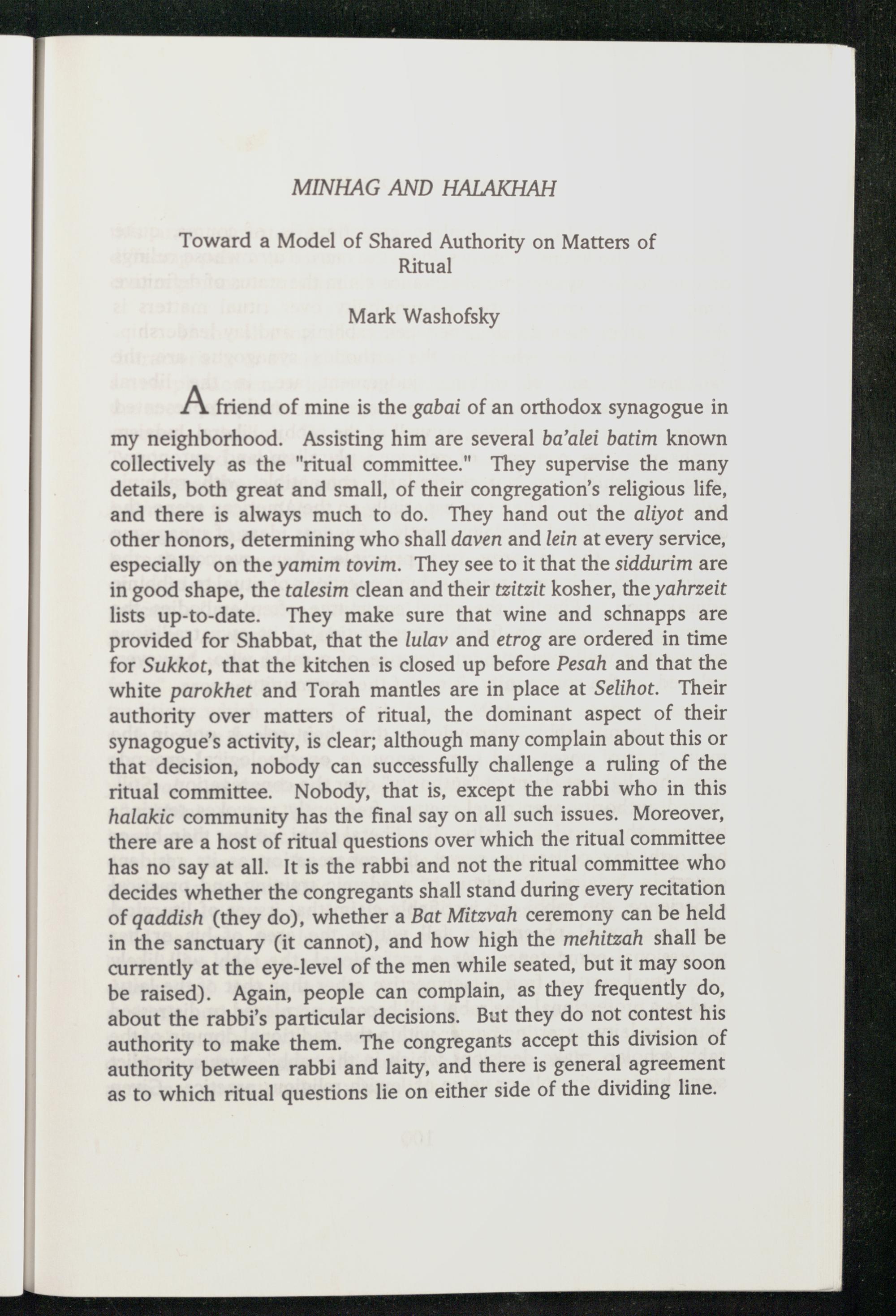 my neighborhood. Assisting him are several ba’alei batim known collectively as the"ritual committee." They supervise the many details, both great and small, of their congregation’s religious life, and there is always much to do. They hand out the aliyot and other honors, determining who shall daven and lein at every service, especially on the yamim tovim. They see to it that the siddurim are in good shape, the talesim clean and their tzitzit kosher, the yahrzeit lists up-to-date. They make sure that wine and schnapps are provided for Shabbat , that the lulav and etrog are ordered in time for Sukkot , that the kitchen is closed up before Pesah and that the white parokhet and Torah mantles are in place at Selihot. Their authority over matters of ritual, the dominant aspect of their synagogue’s activity, is clear; although many complain about this or that decision, nobody can successfully challenge a ruling of the ritual committee. Nobody, that is, except the rabbi who in this halakic community has the final say on all such issues. Moreover, there are a host of ritual questions over which the ritual committee has no say at all. It is the rabbi and not the ritual committee who decides whether the congregants shall stand during every recitation of qaddish(they do), whether a Bat Mitzvah ceremony can be held in the sanctuary(it cannot), and how high the mehitzah shall be currently at the eye-level of the men while seated, but it may soon be raised). Again, people can complain, as they frequently do, about the rabbi’s particular decisions. But they do not contest his authority to make them. The congregants accept this division of authority between rabbi and laity, and there is general agreement as to which ritual questions lie on either side of the dividing line.