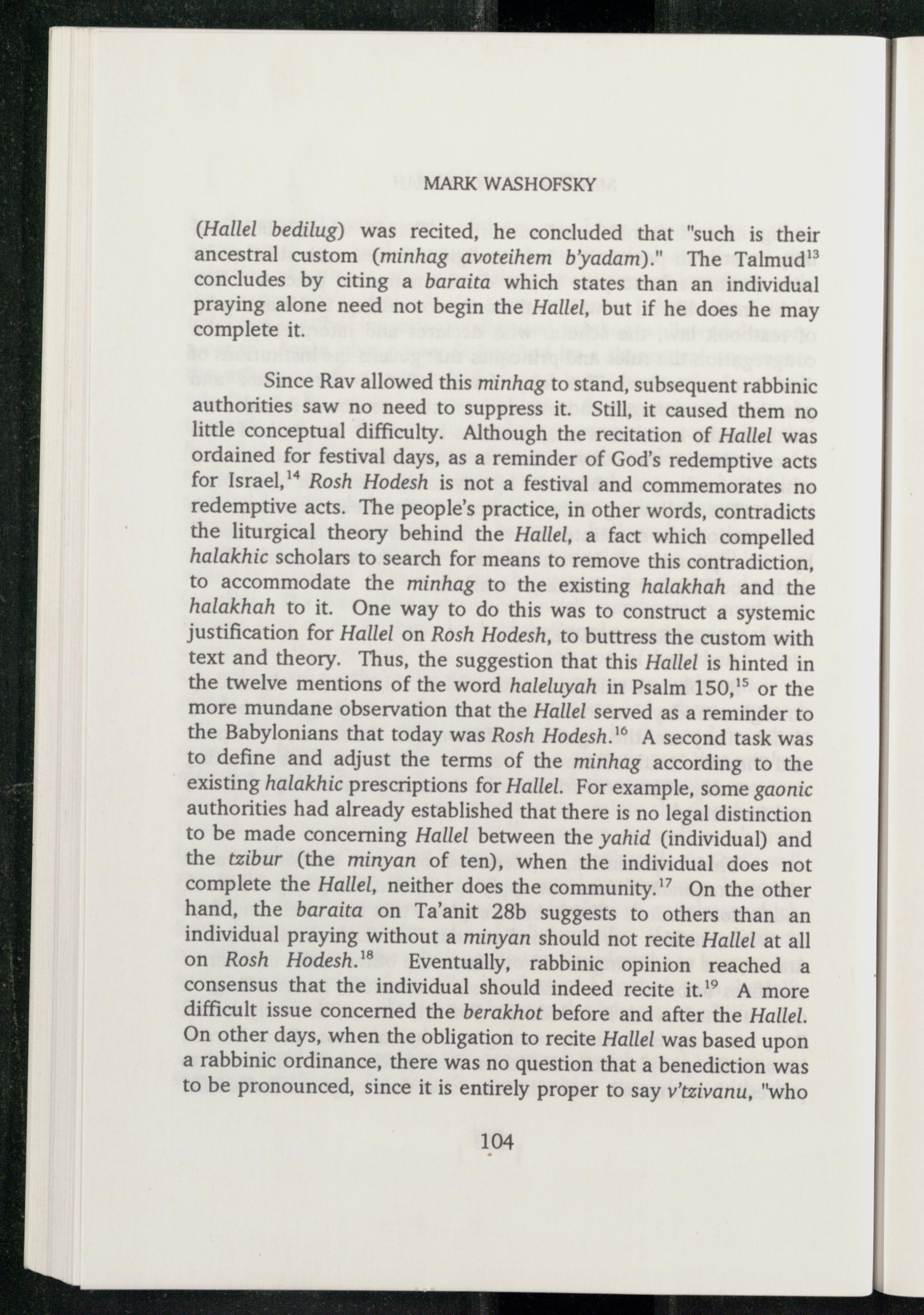 Since Rav allowed this minhag to stand, subsequent rabbinic authorities saw no need to suppress it. Still, it caused them no little conceptual difficulty. Although the recitation of Hallel was ordained for festival days, as a reminder of God 's redemptive acts for Israel, ’ Rosh Hodesh is not a festival and commemorates no redemptive acts. The people's practice, in other words, contradicts the liturgical theory behind the Hallel, a fact which compelled halakhic scholars to search for means to remove this contradiction, to accommodate the minhag to the existing halakhah and the halakhah to it. One way to do this was to construct a systemic justification for Hallel on Rosh Hodesh, to buttress the custom with text and theory. Thus, the suggestion that this Hallel is hinted in the twelve mentions of the word haleluyah in Psalm 150, or the more mundane observation that the Hallel served as a reminder to the Babylonians that today was Rosh Hodesh.'® A second task was to define and adjust the terms of the minhag according to the existing halakhic prescriptions for Hallel. For example, some gaonic authorities had already established that there is no legal distinction to be made concerning Hallel between the yahid(individual) and the tzibur(the minyan of ten), when the individual does not complete the Hallel, neither does the community.” On the other hand, the baraita on Ta'anit 28b suggests to others than an individual praying without a minyan should not recite Hallel at all on Rosh Hodesh.' Eventually, rabbinic opinion reached a consensus that the individual should indeed recite it.'”° A more difficult issue concerned the berakhot before and after the Hallel. On other days, when the obligation to recite Hallel was based upon a rabbinic ordinance, there was no question that a benediction was to be pronounced, since it is entirely proper to say v'tzivanu,"who