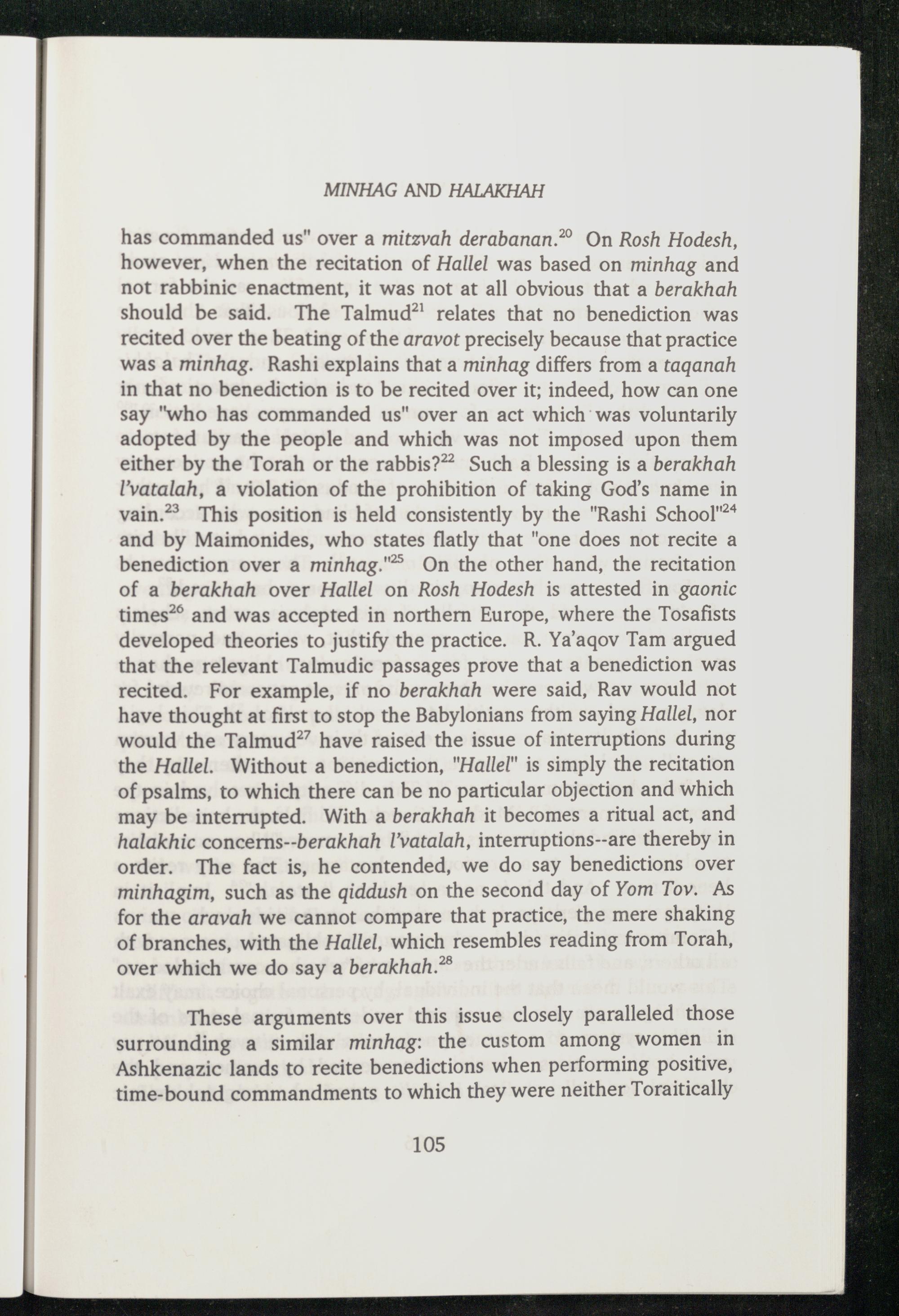 has commanded us" over a mitzvah derabanan.®® On Rosh Hodesh, however, when the recitation of Hallel was based on minhag and not rabbinic enactment, it was not at all obvious that a berakhah should be said. The Talmud ® relates that no benediction was recited over the beating of the aravot precisely because that practice was a minhag. Rashi explains that a minhag differs from a taganah in that no benediction is to be recited over it; indeed, how can one say"who has commanded us" over an act which was voluntarily adopted by the people and which was not imposed upon them either by the Torah or the rabbis?** Such a blessing is a berakhah I'vatalah, a violation of the prohibition of taking God ’s name in vain.®® This position is held consistently by the"Rashi School" and by Maimonides , who states flatly that"one does not recite a benediction over a minhag."® On the other hand, the recitation of a berakhah over Hallel on Rosh Hodesh is attested in gaonic times® and was accepted in northern Europe , where the Tosafists developed theories to justify the practice. R. Ya'aqov Tam argued that the relevant Talmudic passages prove that a benediction was recited. For example, if no berakhah were said, Rav would not have thought at first to stop the Babylonians from saying Hallel, nor would the Talmud ? have raised the issue of interruptions during the Hallel. Without a benediction,"Hallel" is simply the recitation of psalms, to which there can be no particular objection and which may be interrupted. With a berakhah it becomes a ritual act, and halakhic concerns--berakhah I'vatalah, interruptions--are thereby in order. The fact is, he contended, we do say benedictions over minhagim, such as the giddush on the second day of Yom Tov. As for the aravah we cannot compare that practice, the mere shaking of branches, with the Hallel, which resembles reading from Torah , over which we do say a berakhah.*®