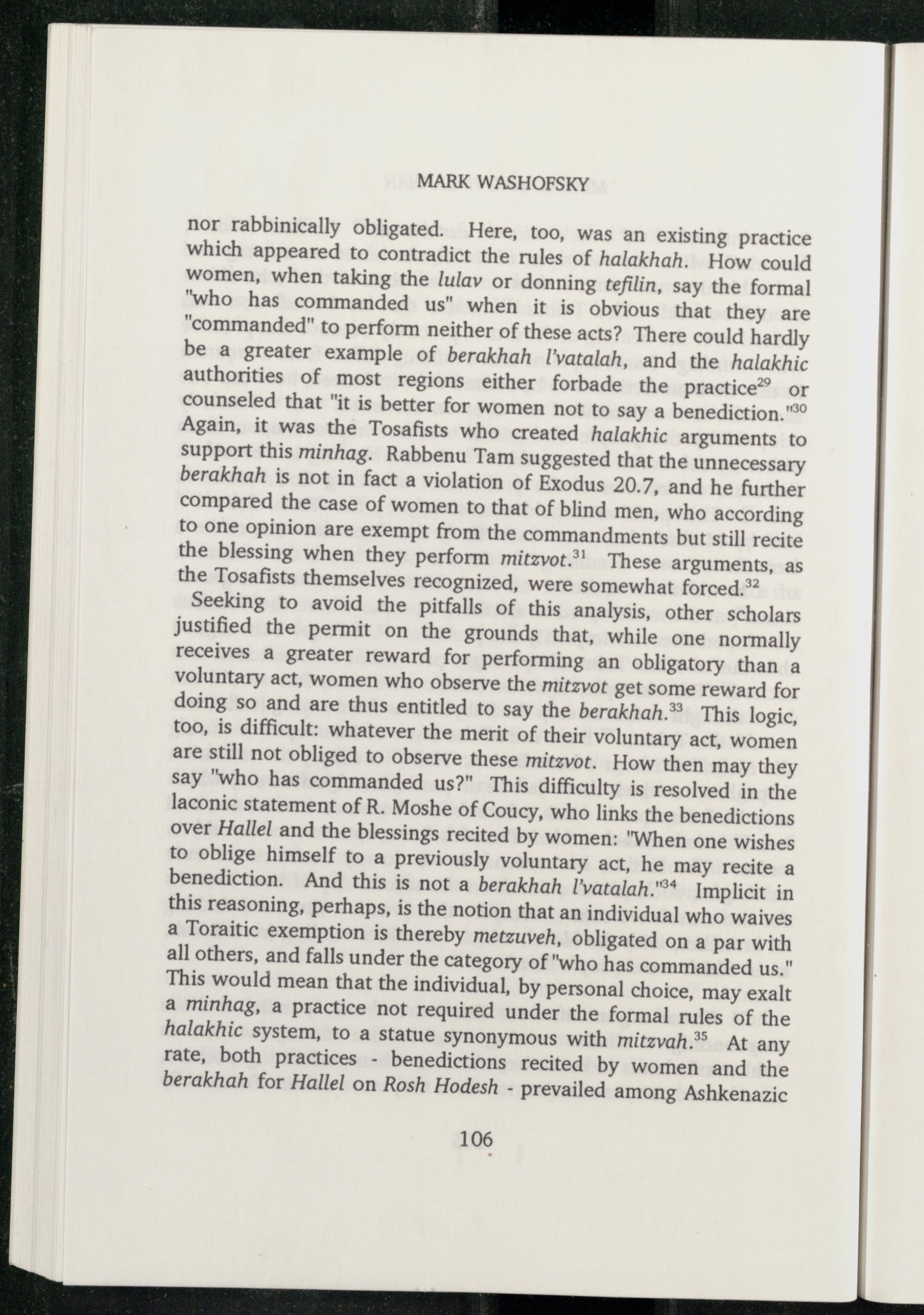 nor rabbinically obligated. Here, too, was an existing practice which appeared to contradict the rules of halakhah. How could women, when taking the lulay or donning tefilin, say the formal "who has commanded us" when it is obvious that they are "commanded" to perform neither of these acts? There could hardly be a greater example of berakhah I'vatalah, and the halakhic authorities of most regions either forbade the practice” or counseled that"it is better for women not to say a benediction." Again, it was the Tosafists who created halakhic arguments to support this minhag. Rabbenu Tam suggested that the unnecessary berakhah is not in fact a violation of Exodus 20.7, and he further compared the case of women to that of blind men, who according to one opinion are exempt from the commandments but still recite the blessing when they perform mitzvot.?! These arguments, as the Tosafists themselves recognized, were somewhat forced. Seeking to avoid the pitfalls of this analysis, other scholars justified the permit on the grounds that, while one normally receives a greater reward for performing an obligatory than a voluntary act, women who observe the mitzvot get some reward for doing so and are thus entitled to say the berakhah.*® This logic, too, is difficult: whatever the merit of their voluntary act, women are still not obliged to observe these mitzvot. How then may they say"who has commanded us?" This difficulty is resolved in the laconic statement of R. Moshe of Coucy, who links the benedictions over Hallel and the blessings recited by women:"When one wishes to oblige himself to a previously voluntary act, he may recite a benediction. And this is not a berakhah I'vatalah."* Implicit in this reasoning, perhaps, is the notion that an individual who waives a Toraitic exemption is thereby metzuveh, obligated on a par with all others, and falls under the category of"who has commanded us." This would mean that the individual, by personal choice, may exalt a minhag, a practice not required under the formal rules of the halakhic system, to a statue synonymous with mitzvah. At any rate, both practices- benedictions recited by women and the berakhah for Hallel on Rosh Hodesh- prevailed among Ashkenazic