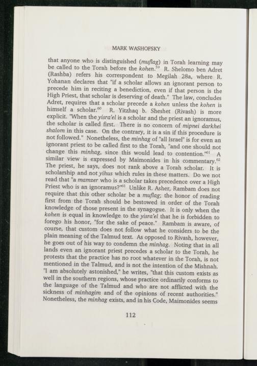 that anyone who is distinguished(muflag) in Torah learning may be called to the Torah before the kohen.*® R. Shelomo ben Adret (Rashba) refers his correspondent to Megilah 28a, where R. Yohanan declares that"if a scholar allows an ignorant person to precede him in reciting a benediction, even if that person is the High Priest, that scholar is deserving of death." The law, concludes Adret, requires that a scholar precede a kohen unless the kohen is himself a scholar.®® R. Yitzhaq b. Sheshet(Rivash ) is more explicit."When the yisra’el is a scholar and the priest an ignoramus, the scholar is called first. There is no concern of mipnei darkhei shalom in this case. On the contrary, it is a sin if this procedure is not followed." Nonetheless, the minhag of"all Israel " is for even an ignorant priest to be called first to the Torah ,"and one should not change this minhag, since this would lead to contention."! A similar view is expressed by Maimonides in his commentary. The priest, he says, does not rank above a Torah scholar. It is scholarship and not yihus which rules in these matters. Do we not read that"a mamzer who is a scholar takes precedence over a High Priest who is an ignoramus?"® Unlike R. Asher, Rambam does not require that this other scholar be a muflag; the honor of reading first from the Torah should be bestowed in order of the Torah knowledge of those present in the synagogue. It is only when the kohen is equal in knowledge to the yisra’el that he is forbidden to forego his honor,"for the sake of peace." Rambam is aware, of course, that custom does not follow what he considers to be the plain meaning of the Talmud text. As opposed to Rivash , however, he goes out of his way to condemn the minhag. Noting that in all lands even an ignorant priest precedes a scholar to the Torah , he protests that the practice has no root whatever in the Torah , is not mentioned in the Talmud , and is not the intention of the Mishnah . "I am absolutely astonished," he writes,"that this custom exists as well in the southern regions, whose practice ordinarily conforms to the language of the Talmud and who are not afflicted with the sickness of minhagim and of the opinions of recent authorities." Nonetheless, the minhag exists, and in his Code, Maimonides seems