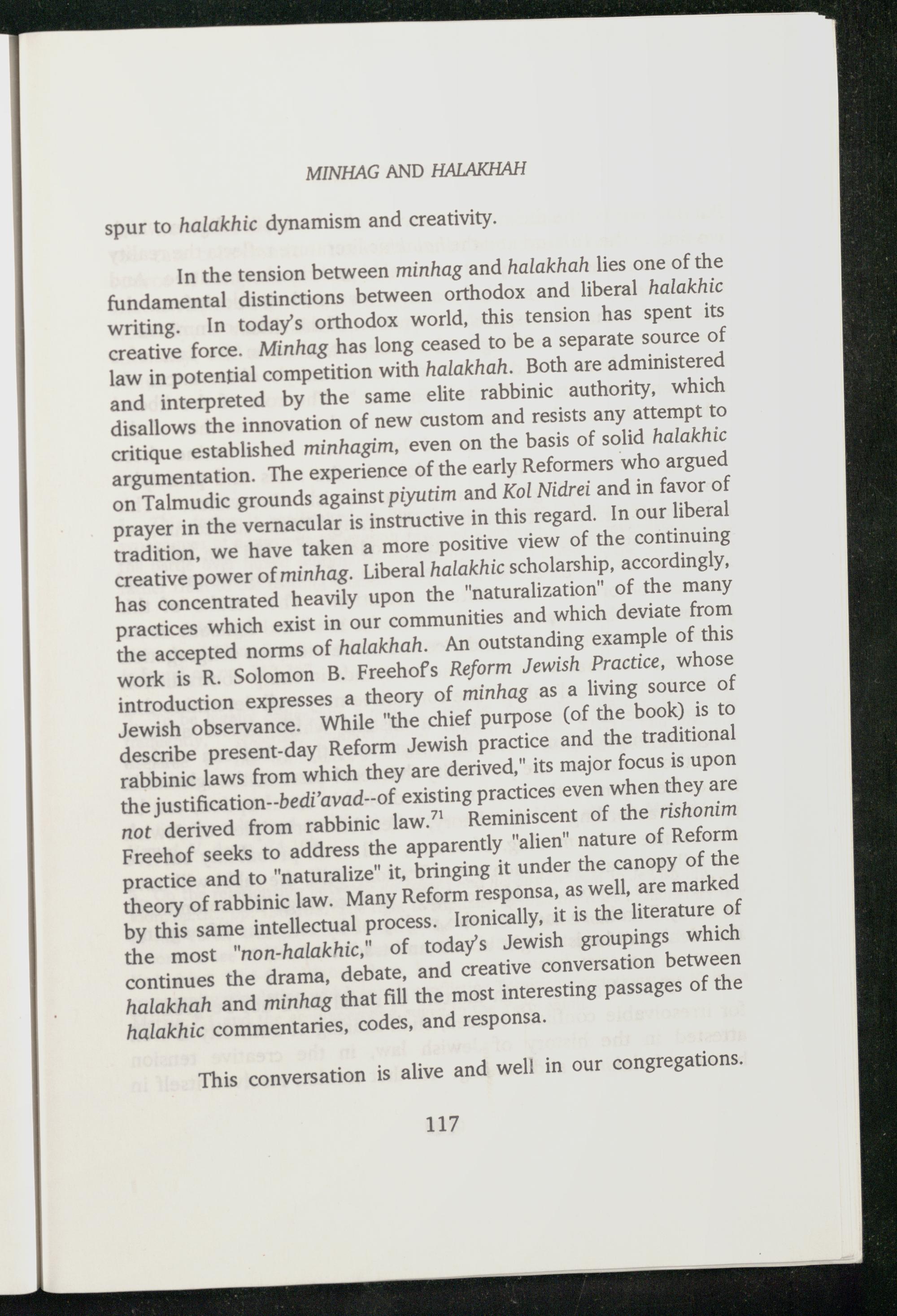 In the tension between minhag and halakhah lies one of the fundamental distinctions between orthodox and liberal halakhic writing. In today’s orthodox world, this tension has spent its creative force. Minhag has long ceased to be a separate source of law in potential competition with halakhah. Both are administered and interpreted by the same elite rabbinic authority, which disallows the innovation of new custom and resists any attempt to critique established minhagim, even on the basis of solid halakhic argumentation. The experience of the early Reformers who argued on Talmudic grounds against piyutim and Kol Nidrei and in favor of prayer in the vernacular is instructive in this regard. In our liberal tradition, we have taken a more positive view of the continuing creative power of minhag. Liberal halakhic scholarship, accordingly, has concentrated heavily upon the"naturalization" of the many practices which exist in our communities and which deviate from the accepted norms of halakhah. An outstanding example of this work is R. Solomon B. Freehofs Reform Jewish Practice, whose introduction expresses a theory of minhag as a living source of Jewish observance. While"the chief purpose(of the book) is to describe present-day Reform Jewish practice and the traditional rabbinic laws from which they are derived," its major focus is upon the justification--bedi’avad--of existing practices even when they are not derived from rabbinic law.” Reminiscent of the rishonim Freehof seeks to address the apparently"alien" nature of Reform practice and to"naturalize" it, bringing it under the canopy of the theory of rabbinic law. Many Reform responsa, as well, are marked by this same intellectual process. Ironically, it is the literature of the most"non-halakhic," of todays Jewish groupings which continues the drama, debate, and creative conversation between halakhah and minhag that fill the most interesting passages of the halakhic commentaries, codes, and responsa.