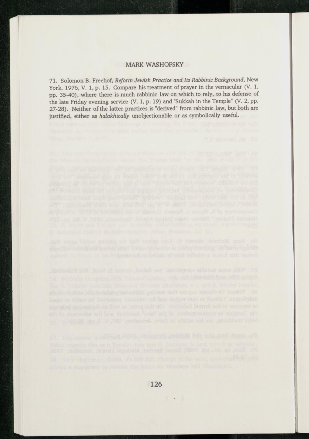 71. Solomon B. Freehof , Reform Jewish Practice and Its Rabbinic Background, New York , 1976, V. 1, p. 15. Compare his treatment of prayer in the vernacular(V. 1, pp. 35-40), where there is much rabbinic law on which to rely, to his defense of the late Friday evening service(V. 1, p. 19) and"Sukkah in the Temple"(V. 2, pp. 27-28). Neither of the latter practices is"derived" from rabbinic law, but both are justified, either as halakhically unobjectionable or as symbolically useful.