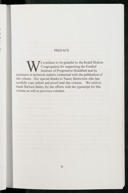 Institute of Progressive Halakhah and its assistance in technical matters connected with the publication of this volume. Our special thanks to Nancy Berkowitz who has carefully copy edited and proof read this volume. We wish to thank Barbara Bailey for her efforts with the typescript for this volume as well as previous volumes.