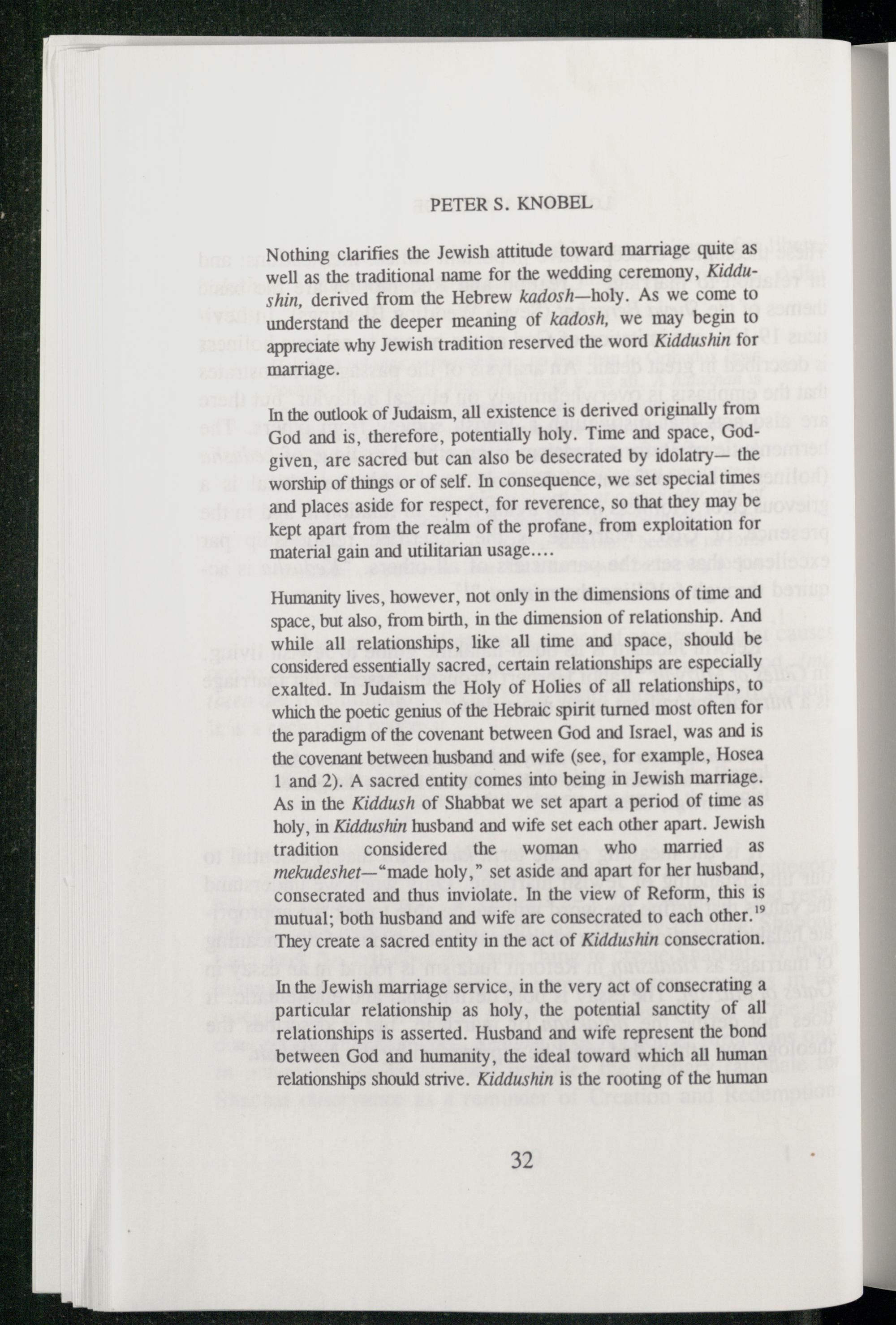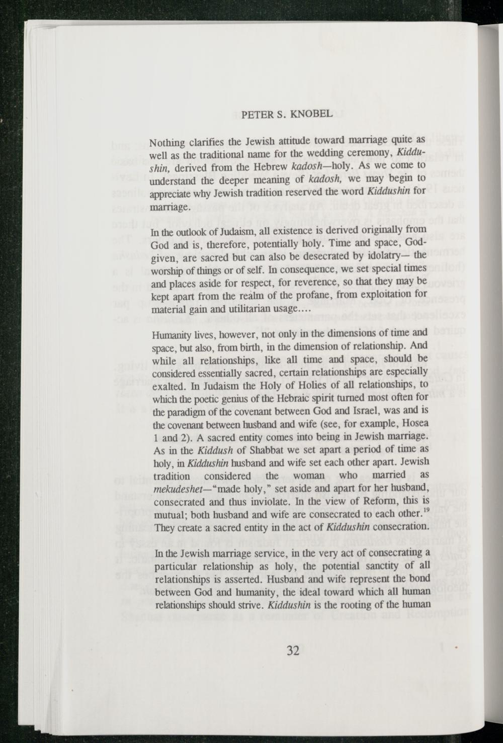 Humanity lives, however, not only in the dimensions of time and space, but also, from birth, in the dimension of relationship. And while all relationships, like all time and space, should be considered essentially sacred, certain relationships are especially exalted. In Judaism the Holy of Holies of all relationships, to which the poetic genius of the Hebraic spirit turned most often for the paradigm of the covenant between God and Israel , was and is the covenant between husband and wife(see, for example, Hosea 1 and 2). A sacred entity comes into being in Jewish marriage. As in the Kiddush of Shabbat we set apart a period of time as holy, in Kiddushin husband and wife set each other apart. Jewish tradition considered the woman who married as mekudeshet—“made holy,” set aside and apart for her husband, consecrated and thus inviolate. In the view of Reform, this is mutual; both husband and wife are consecrated to each other." They create a sacred entity in the act of Kiddushin consecration.