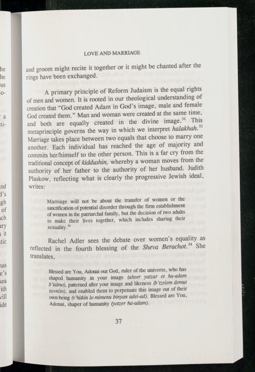 A primary principle of Reform Judaism is the equal rights of men and women. It is rooted in our theological understanding of creation that“God created Adam in God ’s image, male and female God created them.” Man and woman were created at the same time, and both are equally created in the divine image.’ This metaprinciple governs the way in which we interpret halakhah.” Marriage takes place between two equals that choose to marry one another. Each individual has reached the age of majority and commits her/himself to the other person. This is a far cry from the traditional concept of kiddushin, whereby a woman moves from the authority of her father to the authority of her husband. Judith Plaskow , reflecting what is clearly the progressive Jewish ideal, writes: