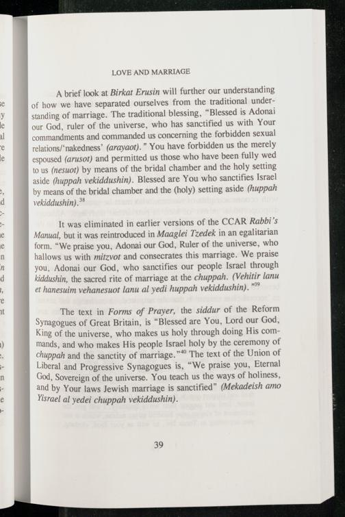 The text in Forms of Prayer, the siddur of the Reform Synagogues of Great Britain, is“Blessed are You, Lord our God, King of the universe, who makes us holy through doing His commands, and who makes His people Israel holy by the ceremony of chuppah and the sanctity of marriage.”* The text of the Union of Liberal and Progressive Synagogues is,“We praise you, Eternal God, Sovereign of the universe. You teach us the ways of holiness, and by Your laws Jewish marriage is sanctified”(Mekadeish amo Yisrael al yedei chuppah vekiddushin).