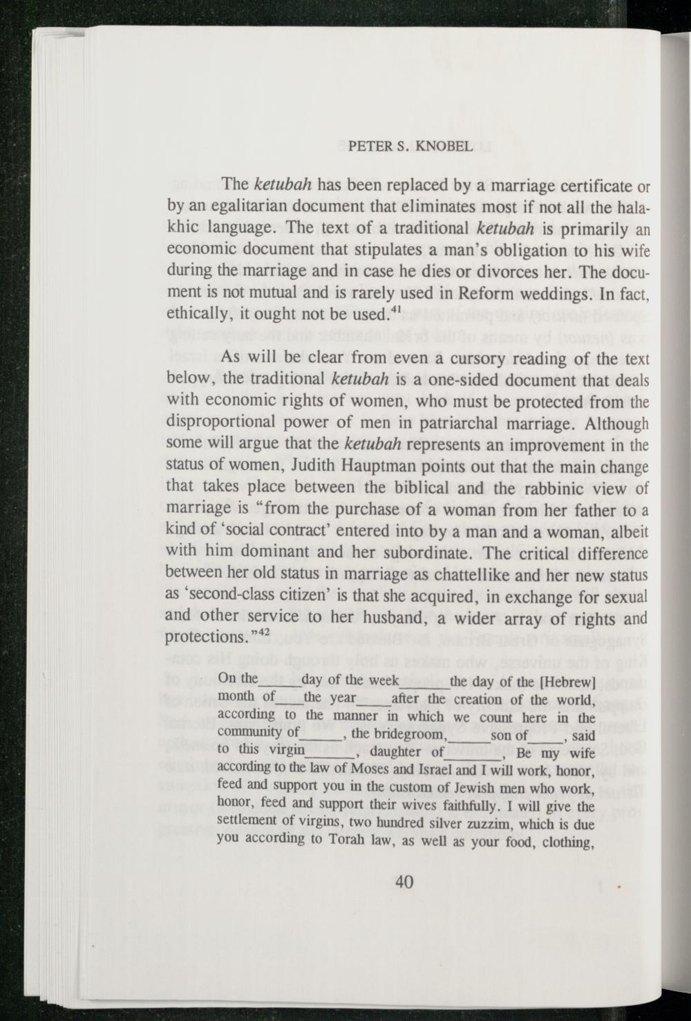 As will be clear from even a cursory reading of the text below, the traditional ketubah is a one-sided document that deals with economic rights of women, who must be protected from the disproportional power of men in patriarchal marriage. Although some will argue that the ketubah represents an improvement in the status of women, Judith Hauptman points out that the main change that takes place between the biblical and the rabbinic view of marriage is“from the purchase of a woman from her father to a kind of‘social contract’ entered into by a man and a woman, albeit with him dominant and her subordinate. The critical difference between her old status in marriage as chattellike and her new status as‘second-class citizen’ is that she acquired, in exchange for sexual and other service to her husband, a wider array of rights and protections.”*?