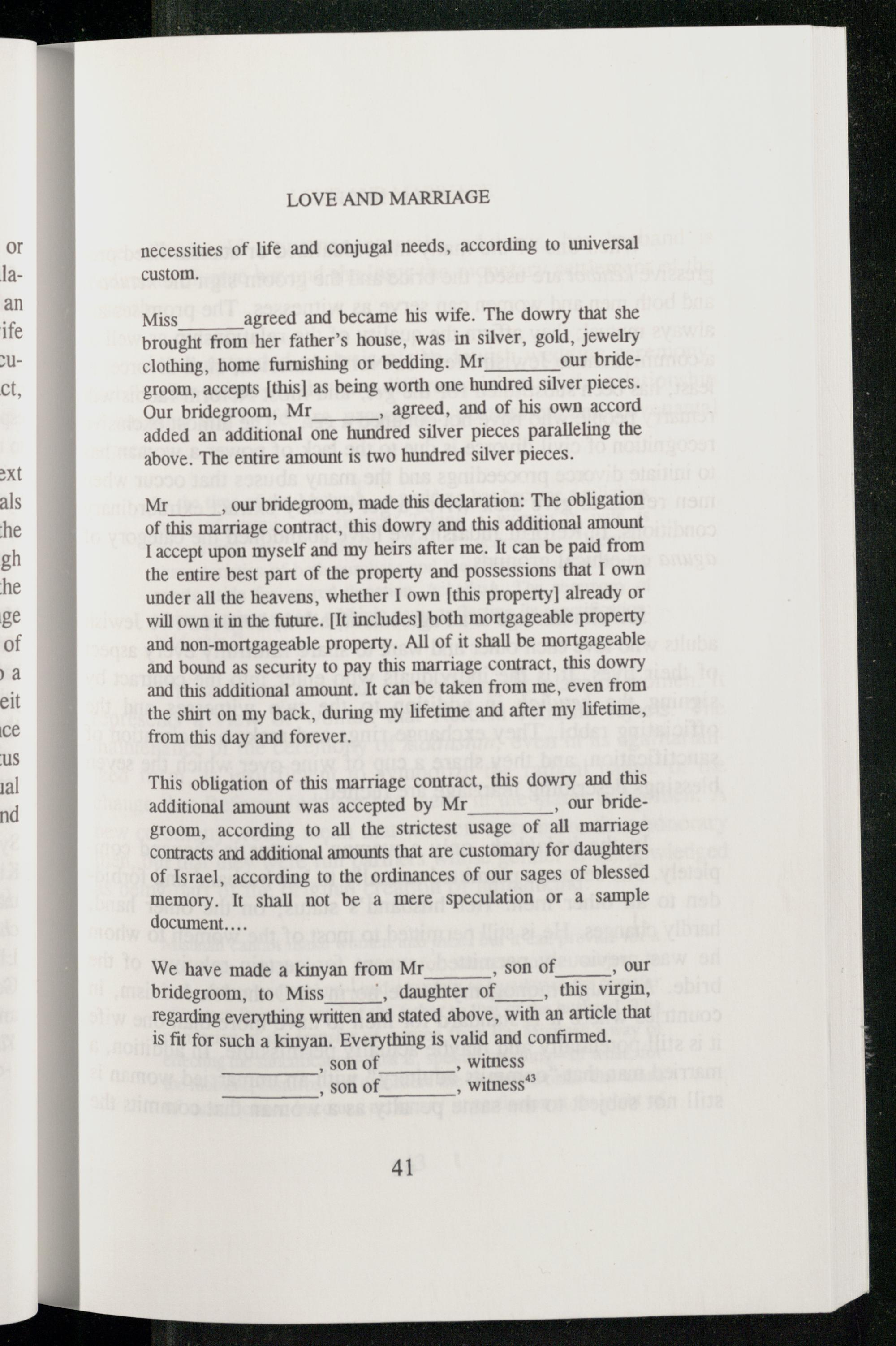 This obligation of this marriage contract, this dowry and this additional amount was accepted by Mr, our bridegroom, according to all the strictest usage of all marriage contracts and additional amounts that are customary for daughters of Israel , according to the ordinances of our sages of blessed memory. It shall not be a mere speculation or a sample document....