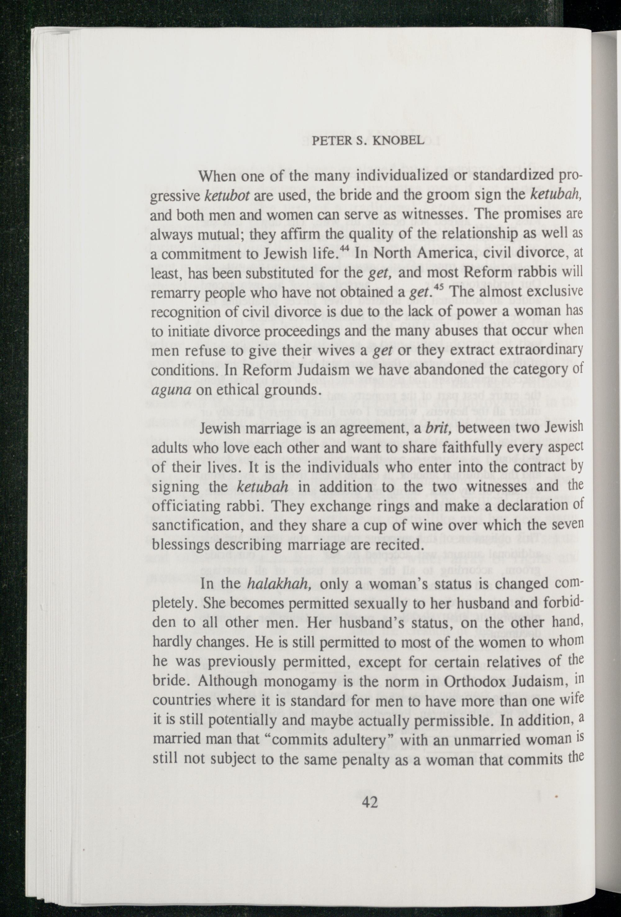 When one of the many individualized or standardized progressive ketubot are used, the bride and the groom sign the ketubah, and both men and women can serve as witnesses. The promises are always mutual; they affirm the quality of the relationship as well as a commitment to Jewish life.* In North America , civil divorce, at least, has been substituted for the get, and most Reform rabbis will remarry people who have not obtained a get.** The almost exclusive recognition of civil divorce is due to the lack of power a woman has to initiate divorce proceedings and the many abuses that occur when men refuse to give their wives a ger or they extract extraordinary conditions. In Reform Judaism we have abandoned the category of aguna on ethical grounds.