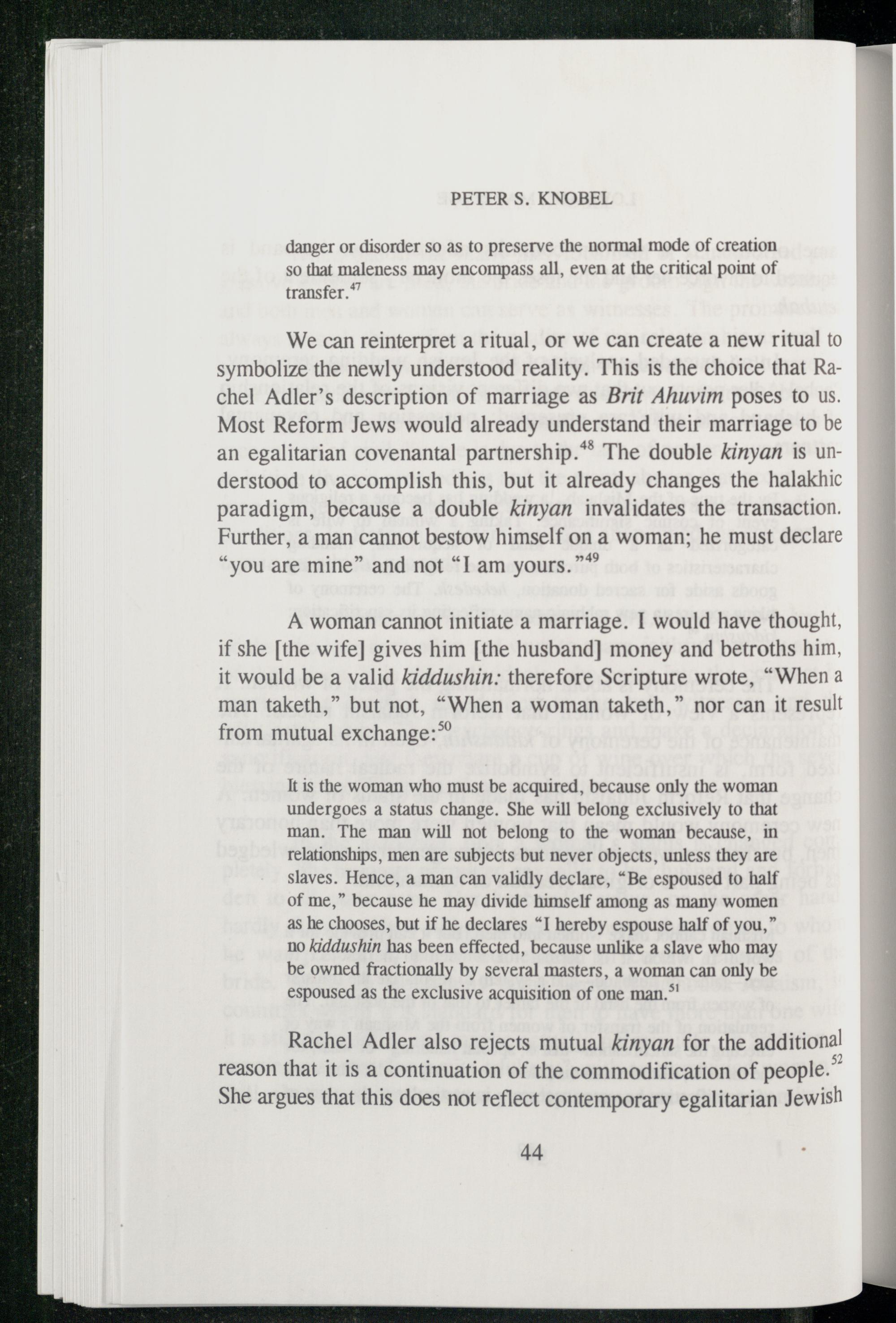 We can reinterpret a ritual, or we can create a new ritual to symbolize the newly understood reality. This is the choice that Ra chel Adler ’s description of marriage as Brit Ahuvim poses to us. Most Reform Jews would already understand their marriage to be an egalitarian covenantal partnership.*® The double kinyan is understood to accomplish this, but it already changes the halakhic paradigm, because a double kinyan invalidates the transaction. Further, a man cannot bestow himself on a woman; he must declare “you are mine” and not“I am yours.”*
