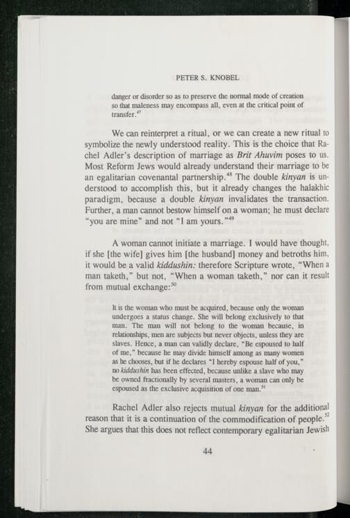 Rachel Adler also rejects mutual kinyan for the additional reason that it is a continuation of the commodification of people.” She argues that this does not reflect contemporary egalitarian Jewish