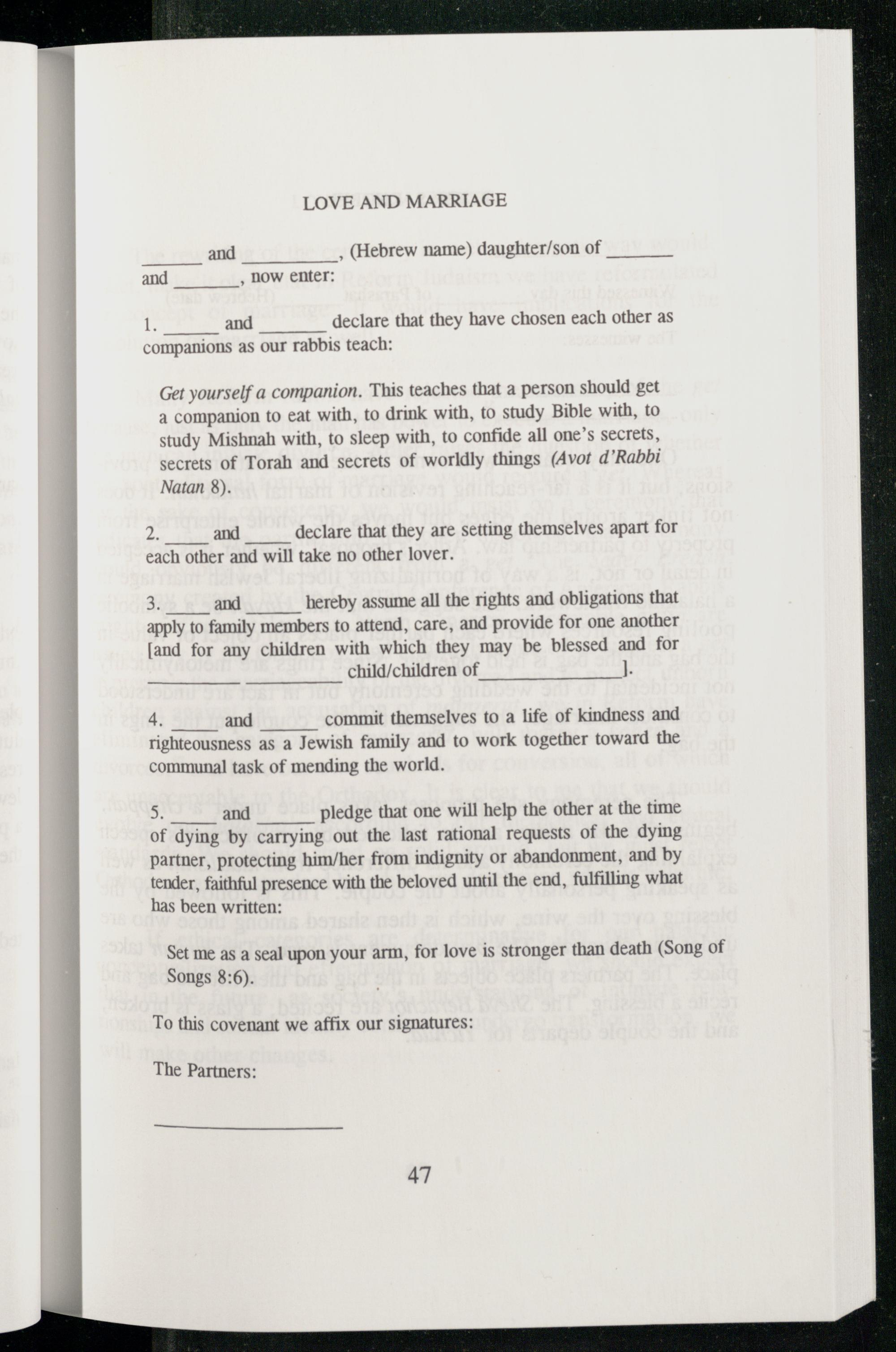 5.= and pledge that one will help the other at the time of dying by carrying out the last rational requests of the dying partner, protecting him/her from indignity or abandonment, and by tender, faithful presence with the beloved until the end, fulfilling what has been written: