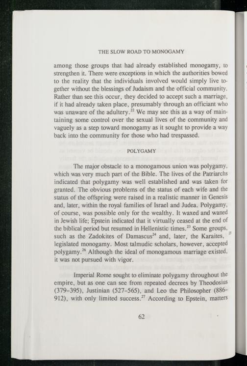 The major obstacle to a monogamous union was polygamy, which was very much part of the Bible . The lives of the Patriarchs indicated that polygamy was well established and was taken for granted. The obvious problems of the status of each wife and the status of the offspring were raised in a realistic manner in Genesis and, later, within the royal families of Israel and Judea . Polygamy, of course, was possible only for the wealthy. It waxed and waned in Jewish life; Epstein indicated that it virtually ceased at the end of the biblical period but resumed in Hellenistic times.* Some groups, such as the Zadokites of Damascus ® and, later, the Karaites , 3 legislated monogamy. Most talmudic scholars, however, accepted polygamy.*® Although the ideal of monogamous marriage existed, it was not pursued with vigor.
