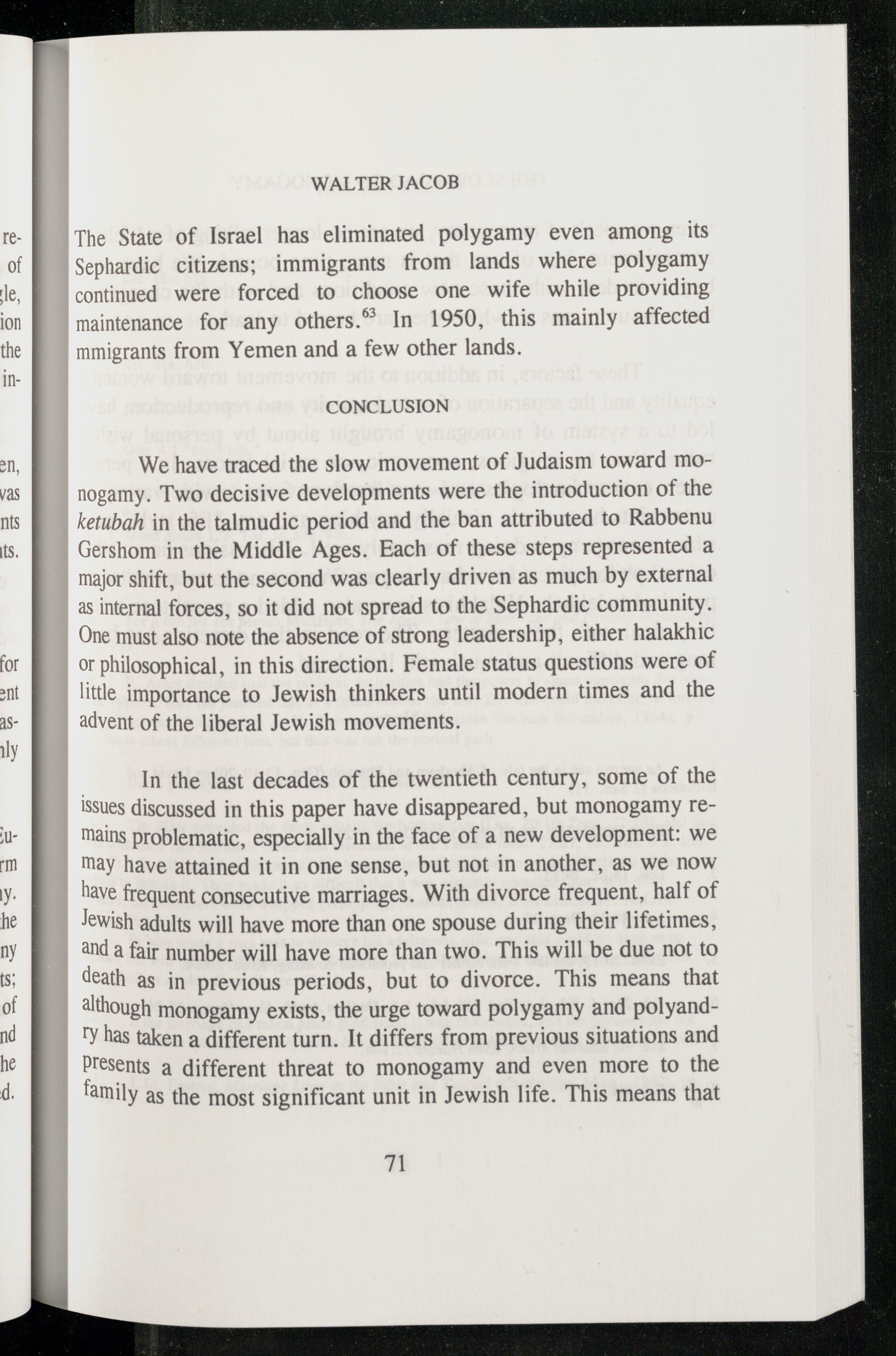 In the last decades of the twentieth century, some of the issues discussed in this paper have disappeared, but monogamy remains problematic, especially in the face of a new development: we may have attained it in one sense, but not in another, as we now have frequent consecutive marriages. With divorce frequent, half of Jewish adults will have more than one spouse during their lifetimes, and a fair number will have more than two. This will be due not to death as in previous periods, but to divorce. This means that although monogamy exists, the urge toward polygamy and polyandry has taken a different turn. It differs from previous situations and Presents a different threat to monogamy and even more to the family as the most significant unit in Jewish life. This means that
