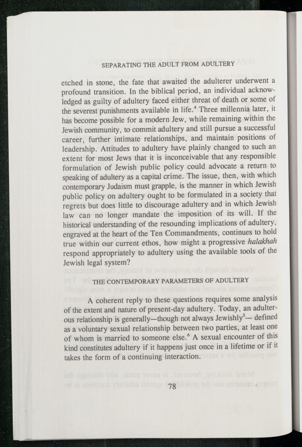 etched in stone, the fate that awaited the adulterer underwent a profound transition. In the biblical period, an individual acknowledged as guilty of adultery faced either threat of death or some of the severest punishments available in life.* Three millennia later, it has become possible for a modern Jew, while remaining within the Jewish community, to commit adultery and still pursue a successful career, further intimate relationships, and maintain positions of leadership. Attitudes to adultery have plainly changed to such an extent for most Jews that it is inconceivable that any responsible formulation of Jewish public policy could advocate a return to speaking of adultery as a capital crime. The issue, then, with which contemporary Judaism must grapple, is the manner in which Jewish public policy on adultery ought to be formulated in a society that regrets but does little to discourage adultery and in which Jewish law can no longer mandate the imposition of its will. If the historical understanding of the resounding implications of adultery, engraved at the heart of the Ten Commandments , continues to hold true within our current ethos, how might a progressive halakhah respond appropriately to adultery using the available tools of the Jewish legal system?