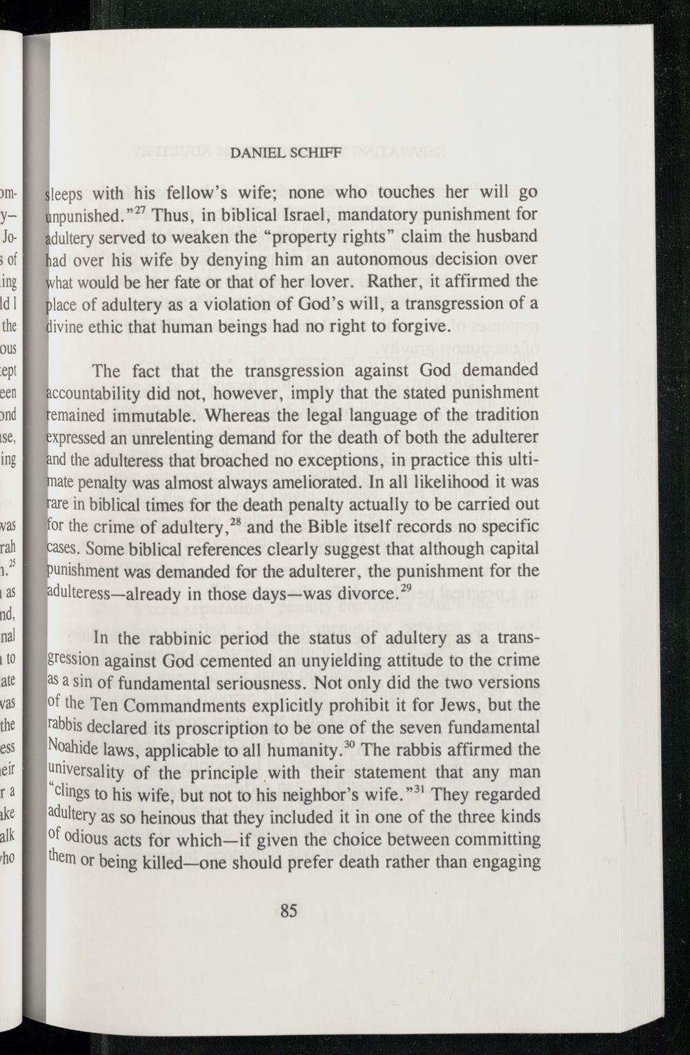 for the crime of adultery,” and the Bible itself records no specific cases. Some biblical references clearly suggest that although capital punishment was demanded for the adulterer, the punishment for the adulteress—already in those days—was divorce.”