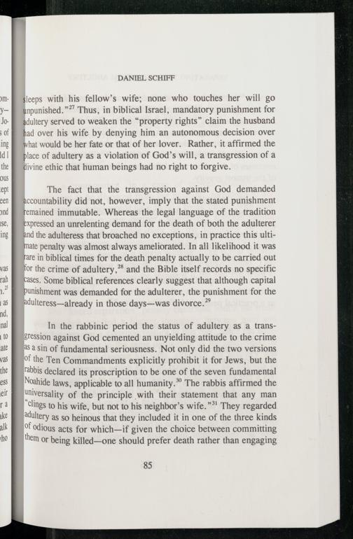 sleeps with his fellow’s wife; none who touches her will go unpunished.” Thus, in biblical Israel , mandatory punishment for adultery served to weaken the“property rights” claim the husband had over his wife by denying him an autonomous decision over what would be her fate or that of her lover. Rather, it affirmed the place of adultery as a violation of God ’s will, a transgression of a divine ethic that human beings had no right to forgive.