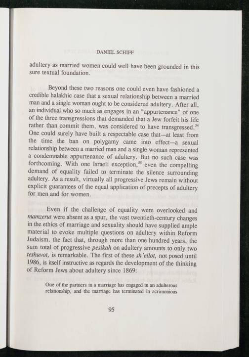 Even if the challenge of equality were overlooked and mamzerut were absent as a spur, the vast twentieth-century changes in the ethics of marriage and sexuality should have supplied ample material to evoke multiple questions on adultery within Reform Judaism. the fact that, through more than one hundred years, the sum total of progressive pesikah on adultery amounts to only two teshuvot, is remarkable. The first of these sh eilot, not posed until 1986, is itself instructive as regards the development of the thinking of Reform Jews about adultery since 1869: