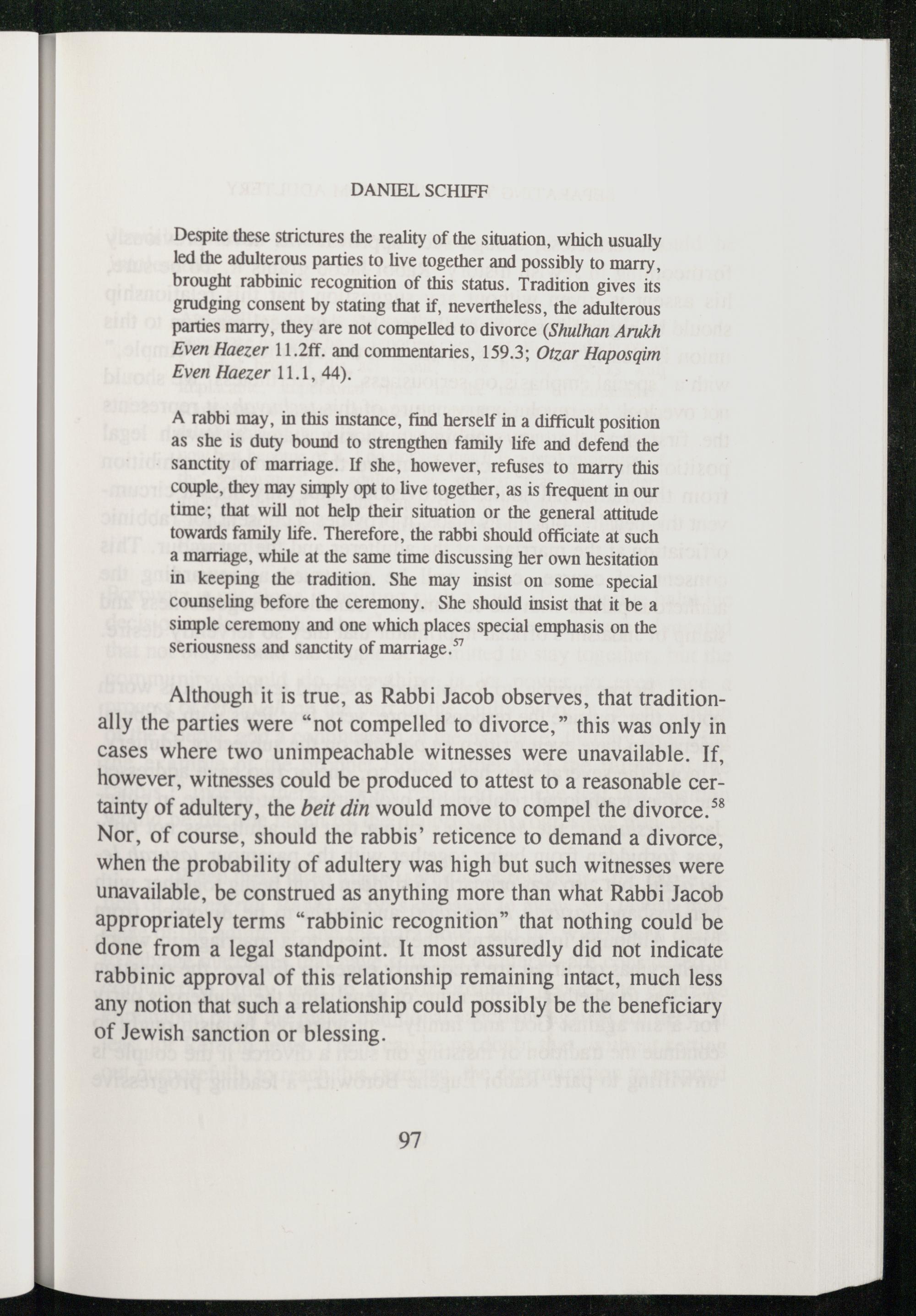 Although it is true, as Rabbi Jacob observes, that traditionally the parties were“not compelled to divorce,” this was only in cases where two unimpeachable witnesses were unavailable. If, however, witnesses could be produced to attest to a reasonable certainty of adultery, the beit din would move to compel the divorce. Nor, of course, should the rabbis’ reticence to demand a divorce, when the probability of adultery was high but such witnesses were unavailable, be construed as anything more than what Rabbi Jacob appropriately terms“rabbinic recognition” that nothing could be done from a legal standpoint. It most assuredly did not indicate rabbinic approval of this relationship remaining intact, much less any notion that such a relationship could possibly be the beneficiary of Jewish sanction or blessing.