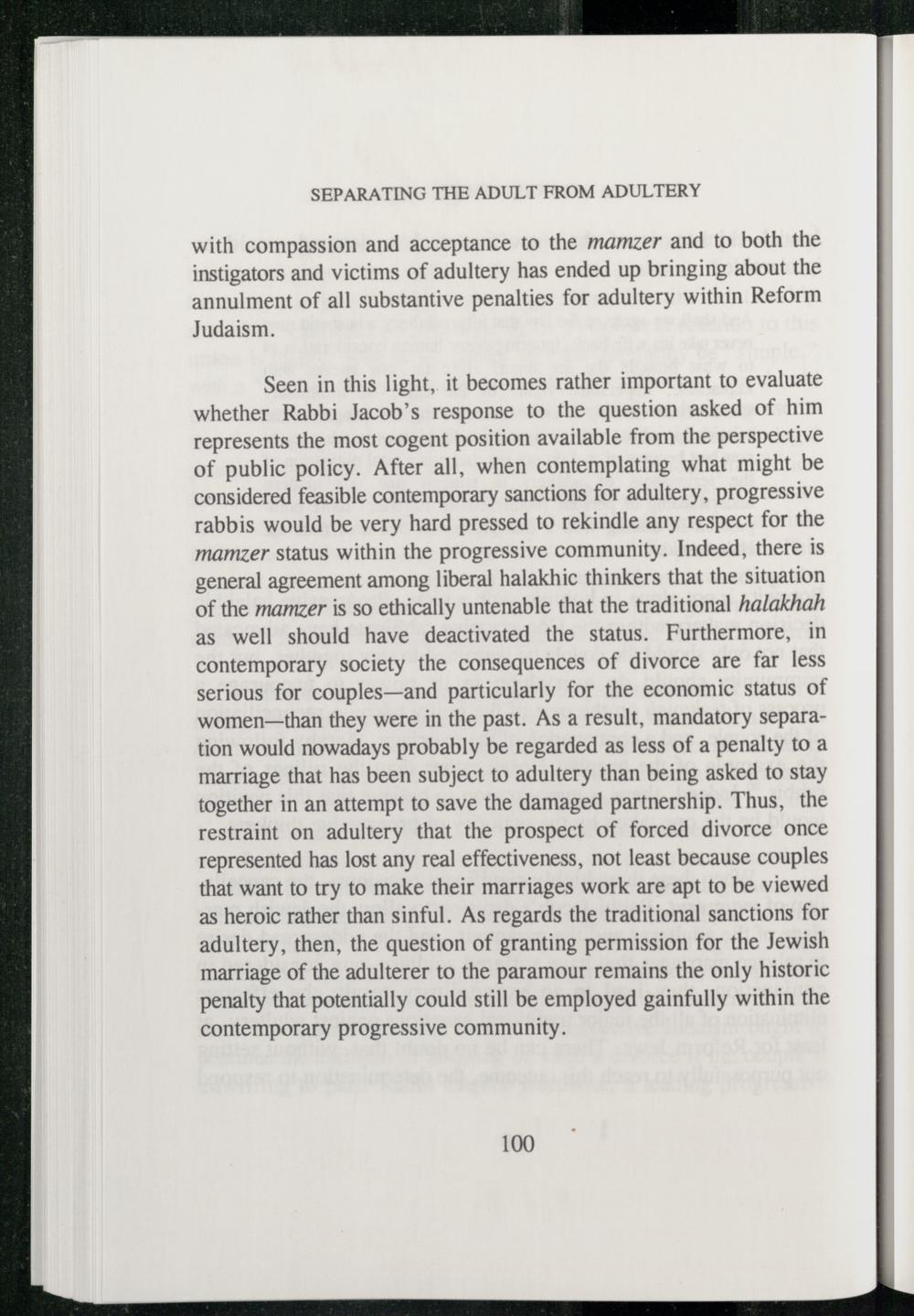 Seen in this light, it becomes rather important to evaluate whether Rabbi Jacob’s response to the question asked of him represents the most cogent position available from the perspective of public policy. After all, when contemplating what might be considered feasible contemporary sanctions for adultery, progressive rabbis would be very hard pressed to rekindle any respect for the mamzer status within the progressive community. Indeed, there is general agreement among liberal halakhic thinkers that the situation of the mamzer is so ethically untenable that the traditional halakhah as well should have deactivated the status. Furthermore, in contemporary society the consequences of divorce are far less serious for couples—and particularly for the economic status of women—than they were in the past. As a result, mandatory separation would nowadays probably be regarded as less of a penalty to a marriage that has been subject to adultery than being asked to stay together in an attempt to save the damaged partnership. Thus, the restraint on adultery that the prospect of forced divorce once represented has lost any real effectiveness, not least because couples that want to try to make their marriages work are apt to be viewed as heroic rather than sinful. As regards the traditional sanctions for adultery, then, the question of granting permission for the Jewish marriage of the adulterer to the paramour remains the only historic penalty that potentially could still be employed gainfully within the contemporary progressive community.
