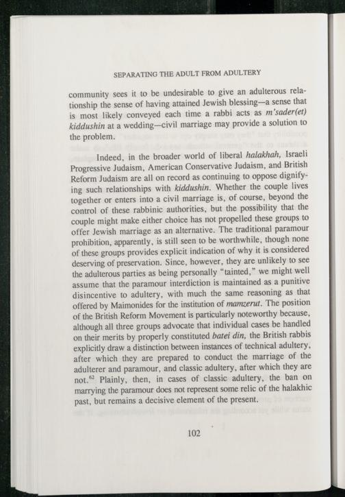 Indeed, in the broader world of liberal halakhah, Israeli Progressive Judaism, American Conservative Judaism, and British Reform Judaism are all on record as continuing to oppose dignifying such relationships with kiddushin. Whether the couple lives together or enters into a civil marriage is, of course, beyond the control of these rabbinic authorities, but the possibility that the couple might make either choice has not propelled these groups to offer Jewish marriage as an alternative. The traditional paramour prohibition, apparently, is still seen to be worthwhile, though none of these groups provides explicit indication of why it is considered deserving of preservation. Since, however, they are unlikely to see the adulterous parties as being personally“tainted,” we might well assume that the paramour interdiction is maintained as a punitive disincentive to adultery, with much the same reasoning as that offered by Maimonides for the institution of mamzerut. The position of the British Reform Movement is particularly noteworthy because, although all three groups advocate that individual cases be handled on their merits by properly constituted batei din, the British rabbis explicitly draw a distinction between instances of technical adultery, after which they are prepared to conduct the marriage of the adulterer and paramour, and classic adultery, after which they are not.” Plainly, then, in cases of classic adultery, the ban on marrying the paramour does not represent some relic of the halakhic past, but remains a decisive element of the present.