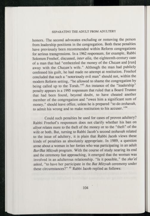 Could such penalties be used for cases of proven adultery? Rabbi Freehof ’s responsum does not clarify whether his ban on aliyot relates more to the theft of the money or to the“theft” of the wife or both. But, turning to Rabbi Jacob’s second teshuvah related to the issue of adultery, it is plain that Rabbi Jacob views these kinds of penalties as absolutely appropriate. In 1989, a question arose about a woman in her forties who was participating in an adult Bar/Bat Mitzvah program. With the course of study nearing its end and the ceremony fast approaching, it emerged that the woman was involved in an adulterous relationship.“Is it possible,” the sho’el asked,“to have her participate in the Bat Mitzvah ceremony under these circumstances?”* Rabbi Jacob replied as follows: