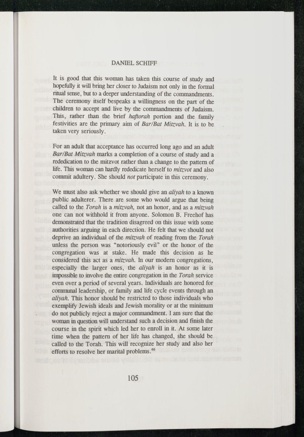 We must also ask whether we should give an aliyah to a known public adulterer. There are some who would argue that being called to the Torah is a mitzvah, not an honor, and as a mitzvah one can not withhold it from anyone. Solomon B. Freehof has demonstrated that the tradition disagreed on this issue with some authorities arguing in each direction. He felt that we should not deprive an individual of the mitzvah of reading from the Torah unless the person was“notoriously evil” or the honor of the congregation was at stake. He made this decision as he considered this act as a mitzvah. In our modern congregations, especially the larger ones, the aliyah is an honor as it is impossible to involve the entire congregation in the Torah service even over a period of several years. Individuals are honored for communal leadership, or family and life cycle events through an aliyah. This honor should be restricted to those individuals who exemplify Jewish ideals and Jewish morality or at the minimum do not publicly reject a major commandment. I am sure that the woman in question will understand such a decision and finish the course in the spirit which led her to enroll in it. At some later time when the pattern of her life has changed, she should be called to the Torah . This will recognize her study and also her efforts to resolve her marital problems.
