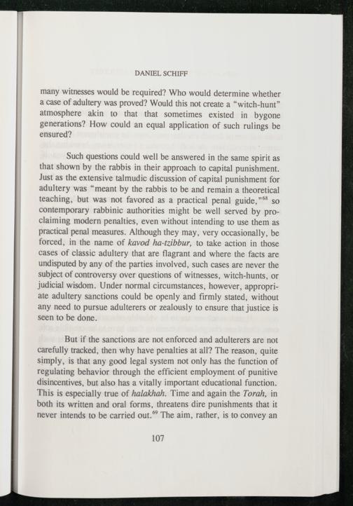 But if the sanctions are not enforced and adulterers are not carefully tracked, then why have penalties at all? The reason, quite simply, is that any good legal system not only has the function of regulating behavior through the efficient employment of punitive disincentives, but also has a vitally important educational function. This is especially true of halakhah. Time and again the Torah , in both its written and oral forms, threatens dire punishments that it never intends to be carried out.” The aim, rather, is to convey an