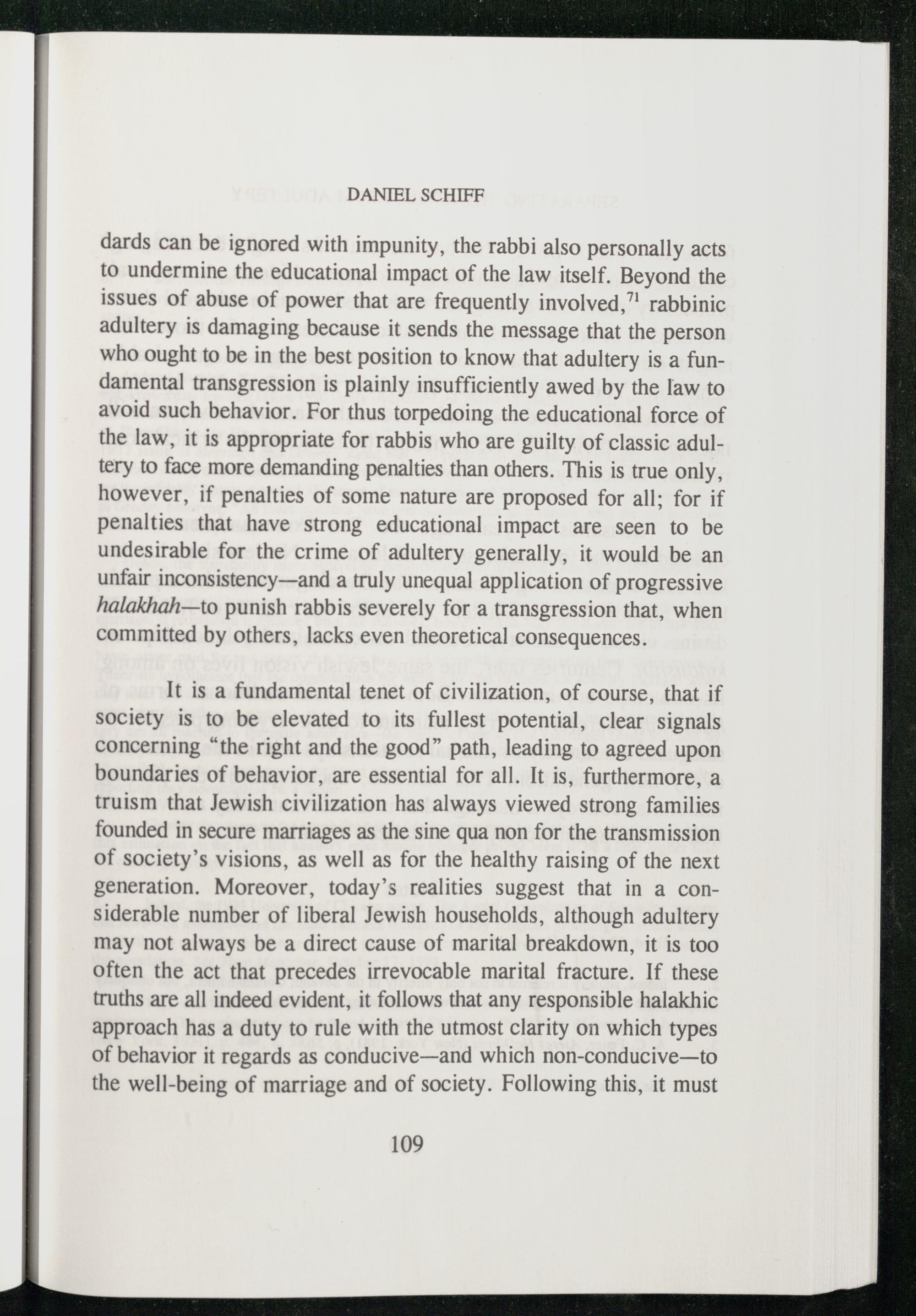 dards can be ignored with impunity, the rabbi also personally acts to undermine the educational impact of the law itself. Beyond the issues of abuse of power that are frequently involved,” rabbinic adultery is damaging because it sends the message that the person who ought to be in the best position to know that adultery is a fundamental transgression is plainly insufficiently awed by the law to avoid such behavior. For thus torpedoing the educational force of the law, it is appropriate for rabbis who are guilty of classic adultery to face more demanding penalties than others. This is true only, however, if penalties of some nature are proposed for all; for if penalties that have strong educational impact are seen to be undesirable for the crime of adultery generally, it would be an unfair inconsistency—and a truly unequal application of progressive halakhah—to punish rabbis severely for a transgression that, when committed by others, lacks even theoretical consequences.