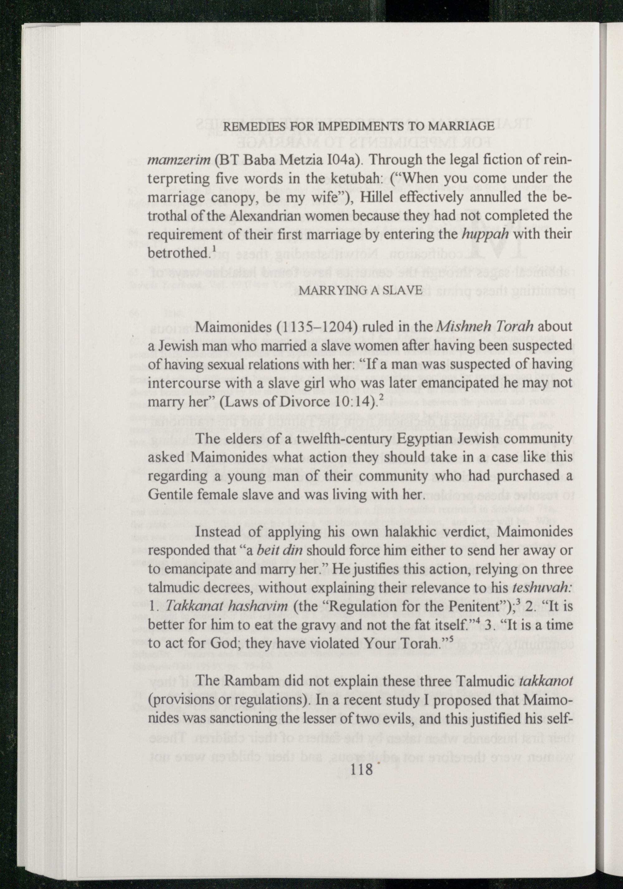 Instead of applying his own halakhic verdict, Maimonides responded that“a beit din should force him either to send her away or to emancipate and marry her.” He justifies this action, relying on three talmudic decrees, without explaining their relevance to his feshuvah: 1. Takkanat hashavim(the“Regulation for the Penitent”);® 2.“It is better for him to eat the gravy and not the fat itself.” 3.“It is a time to act for God ; they have violated Your Torah.”*