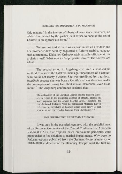 We are not told if there was a case in which a widow and her brother-in-law actually requested a Reform rabbi to conduct such a ceremony. Did a non-Orthodox rabbi actually officiate at this archaic ritual? What was its“appropriate form”? The sources are silent.