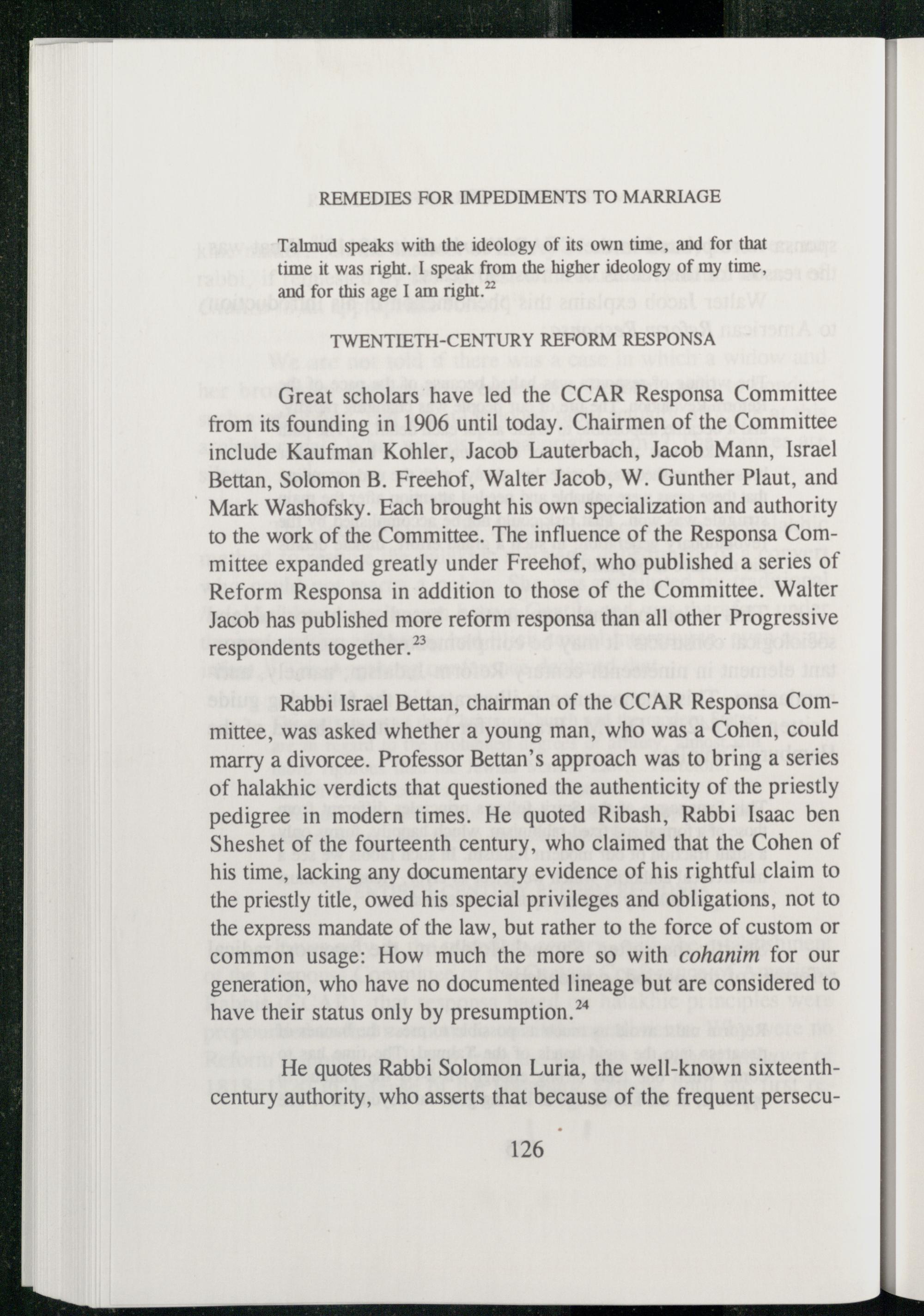 Rabbi Israel Bettan, chairman of the CCAR Responsa Committee, was asked whether a young man, who was a Cohen, could marry a divorcee. Professor Bettan’s approach was to bring a series of halakhic verdicts that questioned the authenticity of the priestly pedigree in modern times. He quoted Ribash, Rabbi Isaac ben Sheshet of the fourteenth century, who claimed that the Cohen of his time, lacking any documentary evidence of his rightful claim to the priestly title, owed his special privileges and obligations, not to the express mandate of the law, but rather to the force of custom or common usage: How much the more so with cohanim for our generation, who have no documented lineage but are considered to have their status only by presumption.*