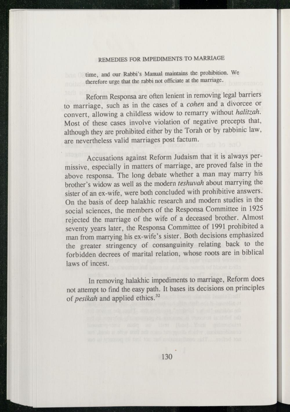 In removing halakhic impediments to marriage, Reform does not attempt to find the easy path. It bases its decisions on principles of pesikah and applied ethics.”