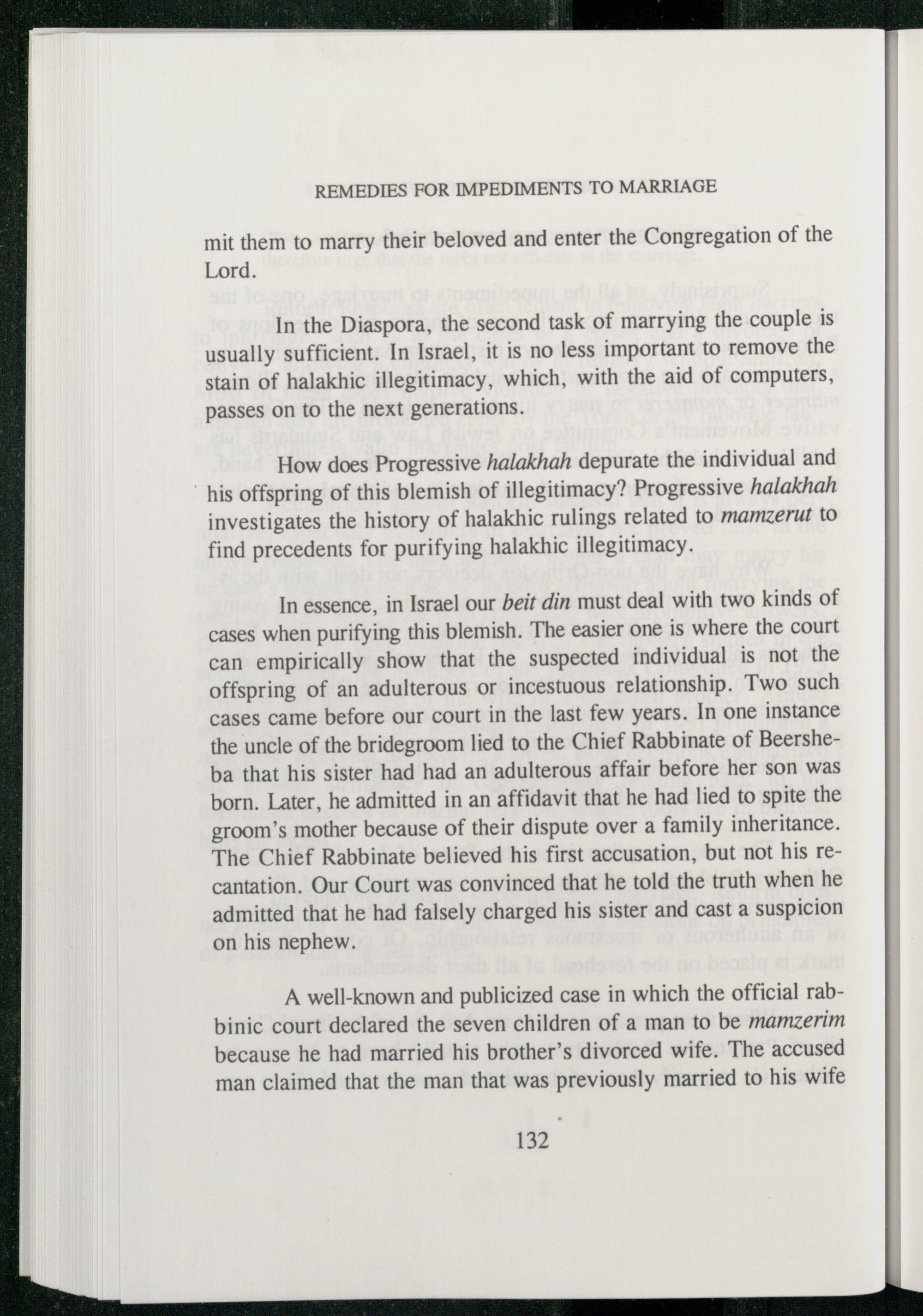 In essence, in Israel our beit din must deal with two kinds of cases when purifying this blemish. The easier one is where the court can empirically show that the suspected individual is not the offspring of an adulterous or incestuous relationship. Two such cases came before our court in the last few years. In one instance the uncle of the bridegroom lied to the Chief Rabbinate of Beershe ba that his sister had had an adulterous affair before her son was born. Later, he admitted in an affidavit that he had lied to spite the groom’s mother because of their dispute over a family inheritance. The Chief Rabbinate believed his first accusation, but not his recantation. Our Court was convinced that he told the truth when he admitted that he had falsely charged his sister and cast a suspicion on his nephew.