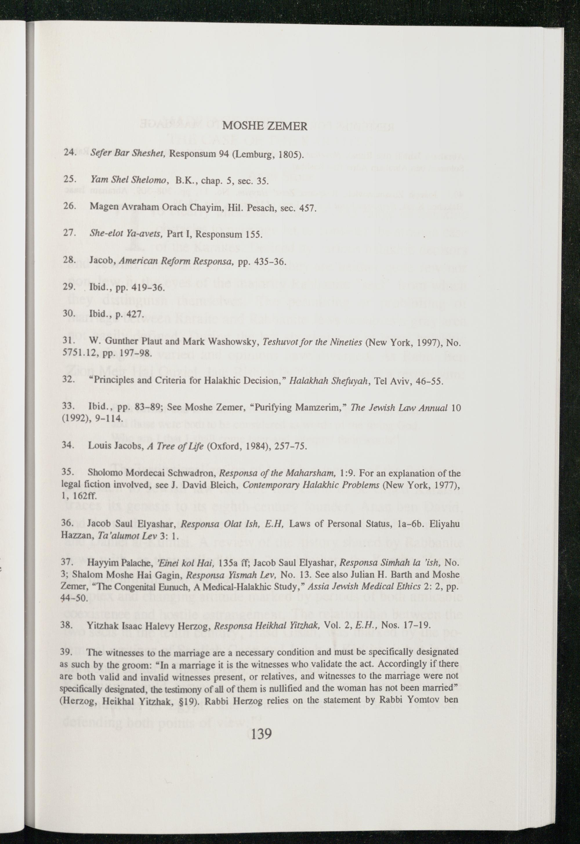 MOSHE ZEMER Sefer Bar Sheshet, Responsum 94(Lemburg, 1805). Yam Shel Shelomo, B.K., chap. 5, sec. 35. Magen Avraham Orach Chayim, Hil. Pesach , sec. 457. She-elot Ya-avets, Part I, Responsum 155. Jacob, American Reform Responsa, pp. 435-36. Ibid., pp. 419-36. Ibid., p. 427.