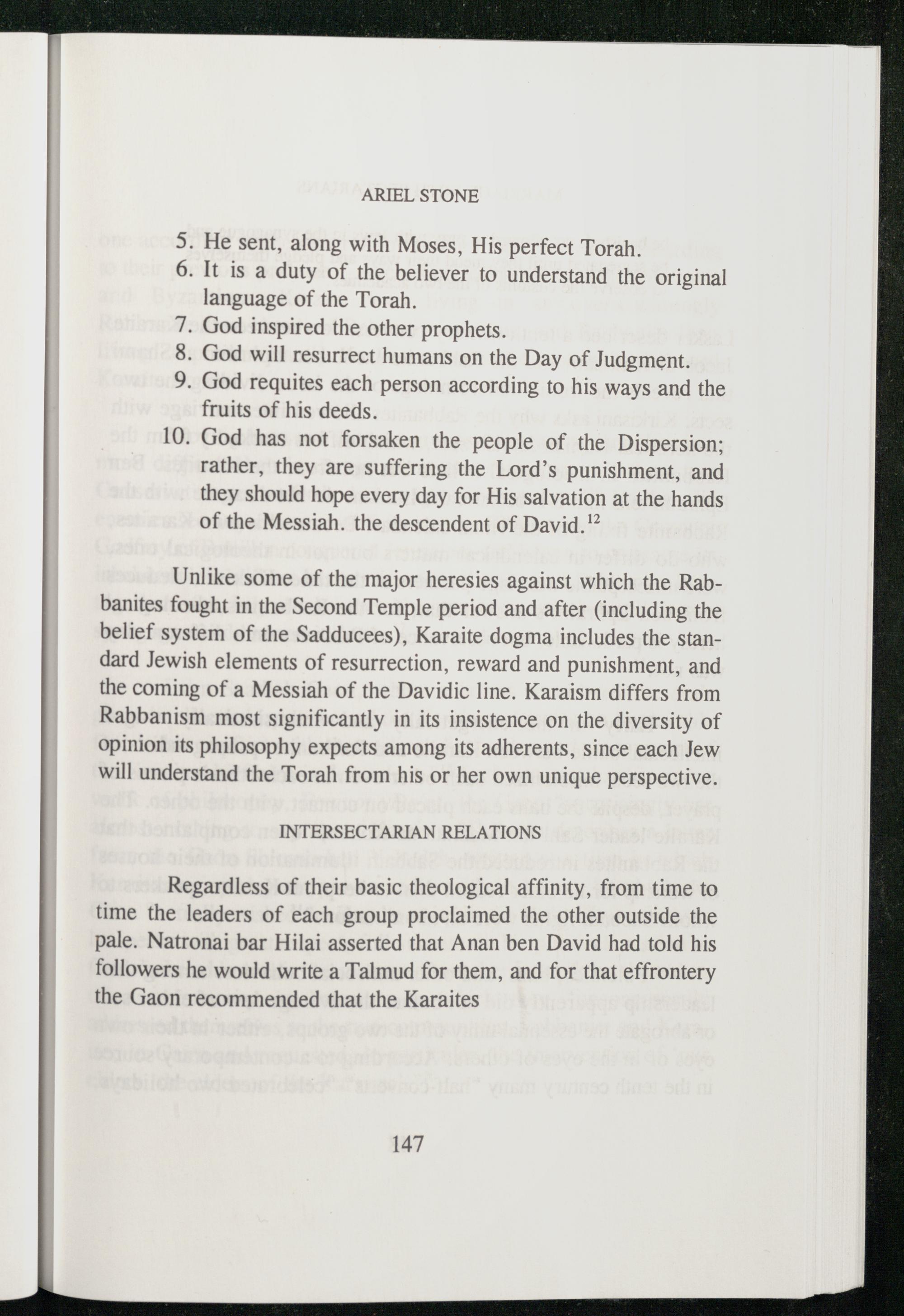 Unlike some of the major heresies against which the Rabbanites fought in the Second Temple period and after(including the belief system of the Sadducees), Karaite dogma includes the standard Jewish elements of resurrection, reward and punishment, and the coming of a Messiah of the Davidic line. Karaism differs from Rabbanism most significantly in its insistence on the diversity of opinion its philosophy expects among its adherents, since each Jew will understand the Torah from his or her own unique perspective.