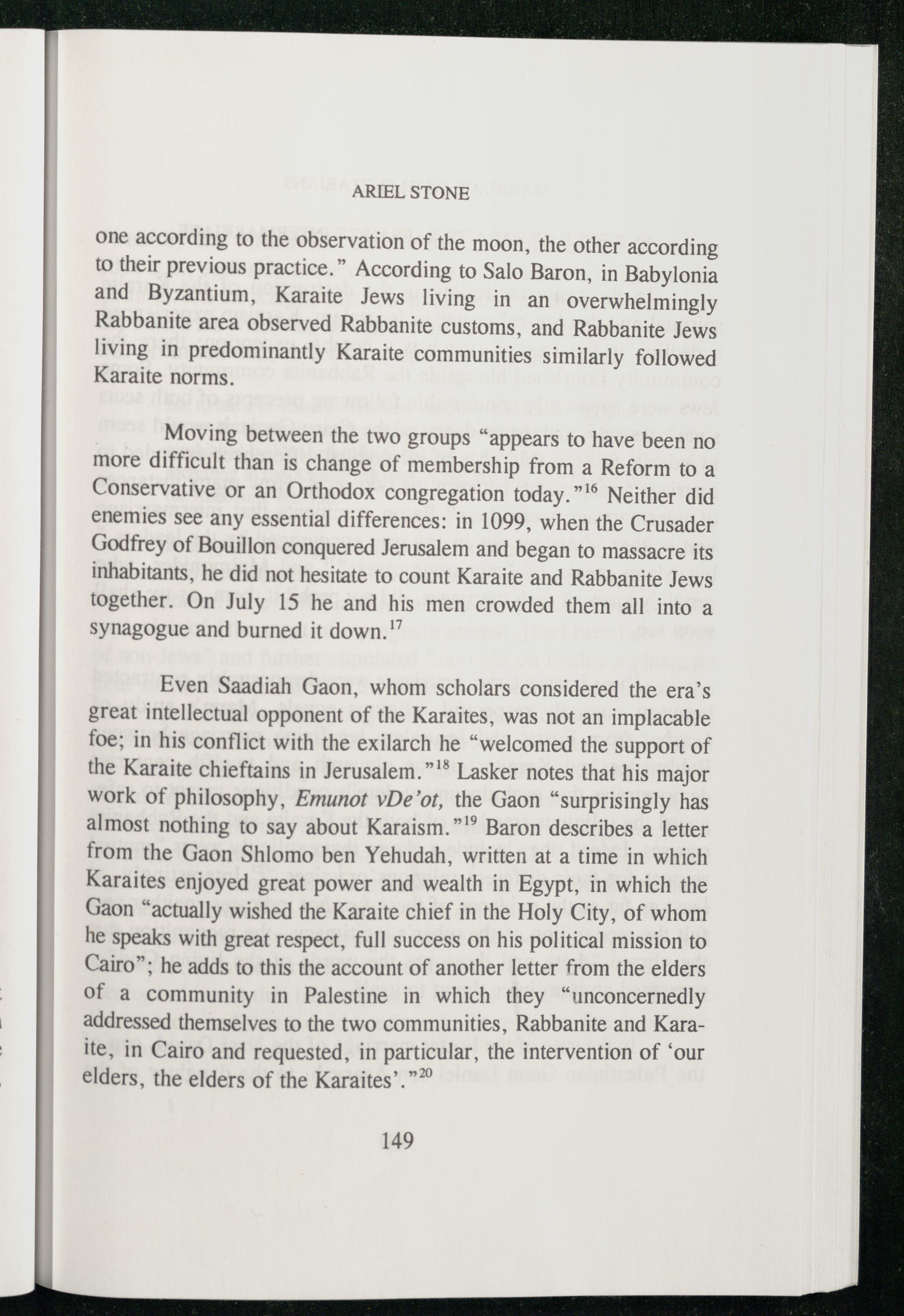 Even Saadiah Gaon , whom scholars considered the era’s great intellectual opponent of the Karaites , was not an implacable foe; in his conflict with the exilarch he“welcomed the support of the Karaite chieftains in Jerusalem .”'® Lasker notes that his major work of philosophy, Emunot vDe’ot, the Gaon “surprisingly has almost nothing to say about Karaism .”'® Baron describes a letter from the Gaon Shlomo ben Yehudah, written at a time in which Karaites enjoyed great power and wealth in Egypt , in which the Gaon “actually wished the Karaite chief in the Holy City, of whom he speaks with great respect, full success on his political mission to Cairo”; he adds to this the account of another letter from the elders of a community in Palestine in which they“unconcernedly addressed themselves to the two communities, Rabbanite and Kara ite , in Cairo and requested, in particular, the intervention of‘our elders, the elders of the Karaites ’.””