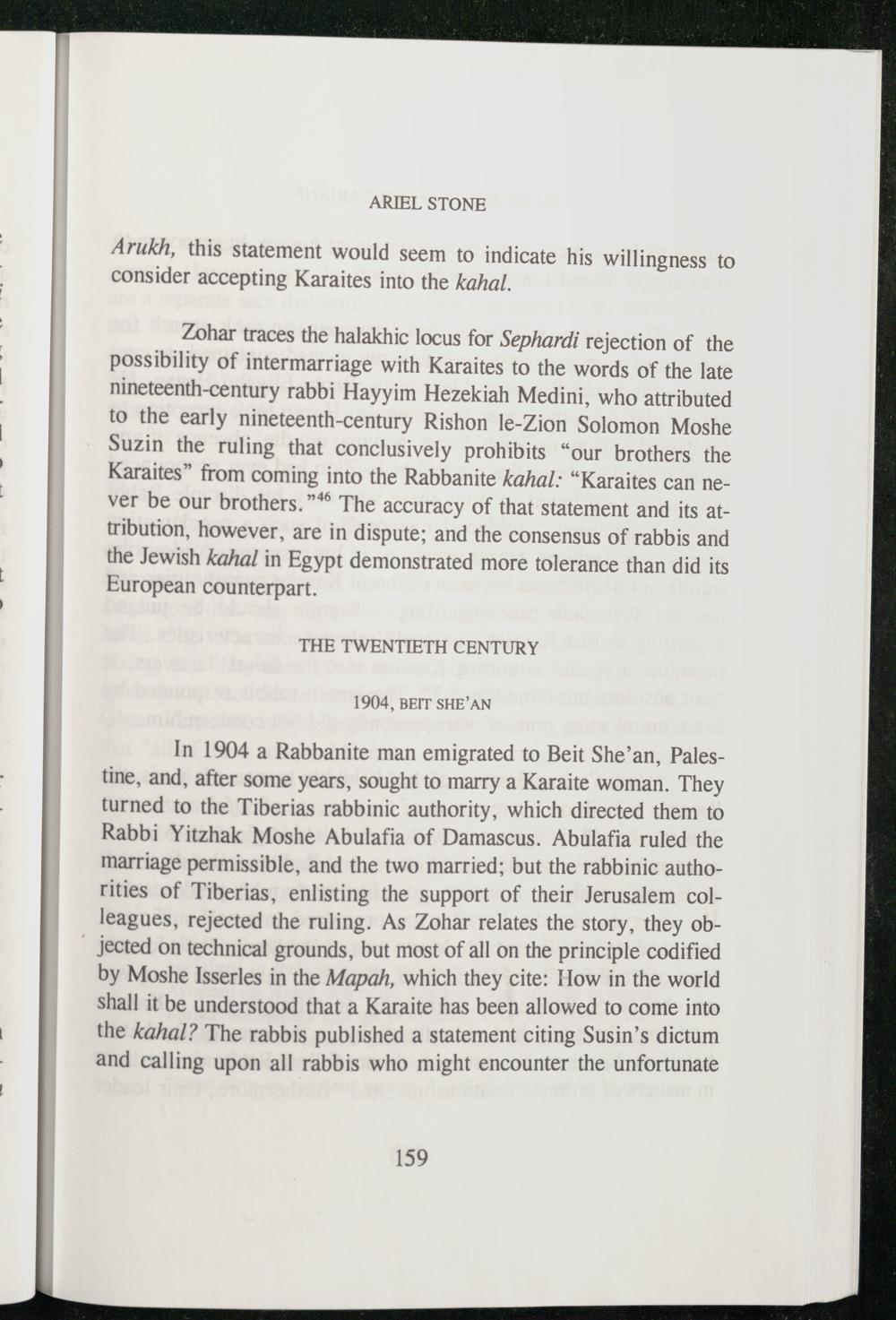 In 1904 a Rabbanite man emigrated to Beit She’an , Palestine, and, after some years, sought to marry a Karaite woman. They turned to the Tiberias rabbinic authority, which directed them to Rabbi Yitzhak Moshe Abulafia of Damascus . Abulafia ruled the marriage permissible, and the two married; but the rabbinic authorities of Tiberias, enlisting the support of their Jerusalem colleagues, rejected the ruling. As Zohar relates the story, they ob~ jected on technical grounds, but most of all on the principle codified by Moshe Isserles in the Mapah, which they cite: How in the world shall it be understood that a Karaite has been allowed to come into the kahal? The rabbis published a statement citing Susin’s dictum and calling upon all rabbis who might encounter the unfortunate
